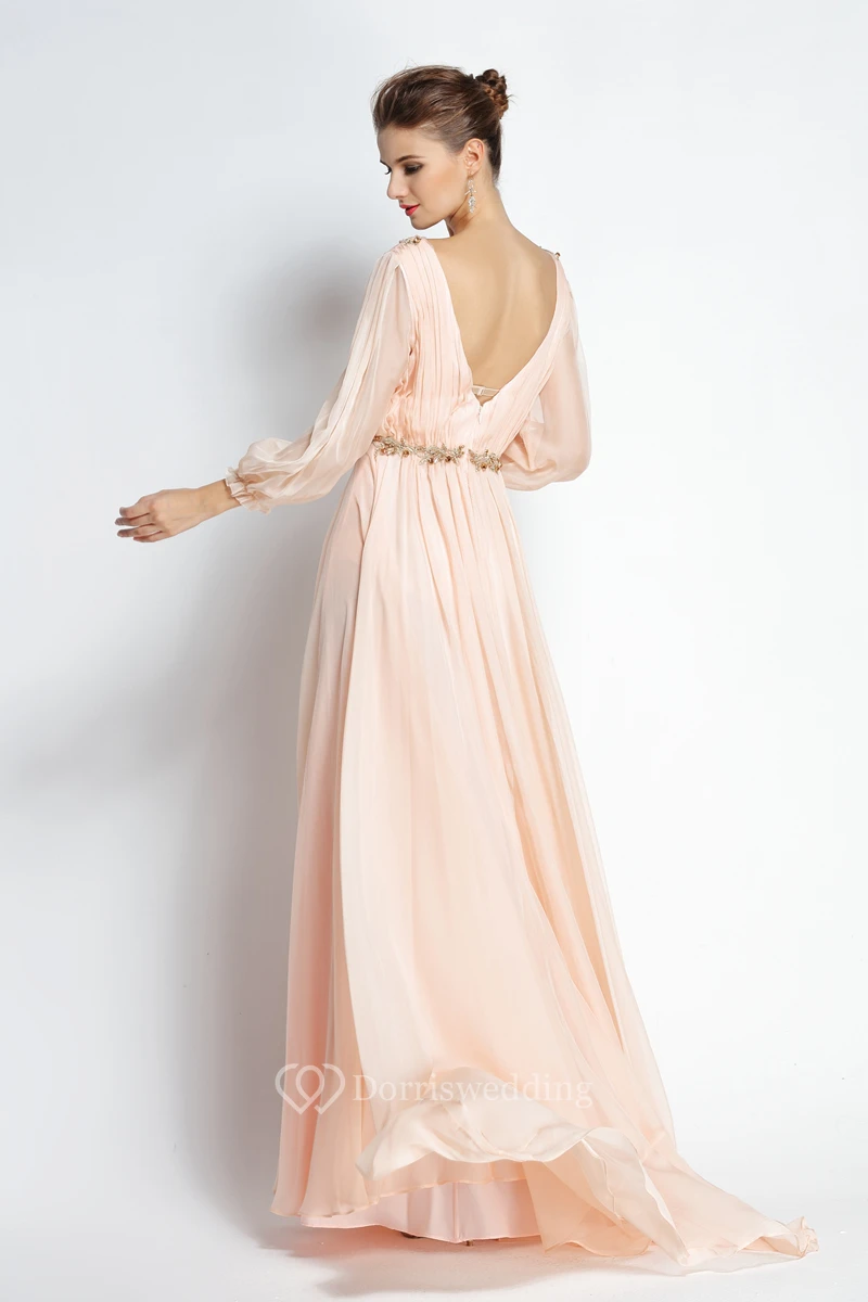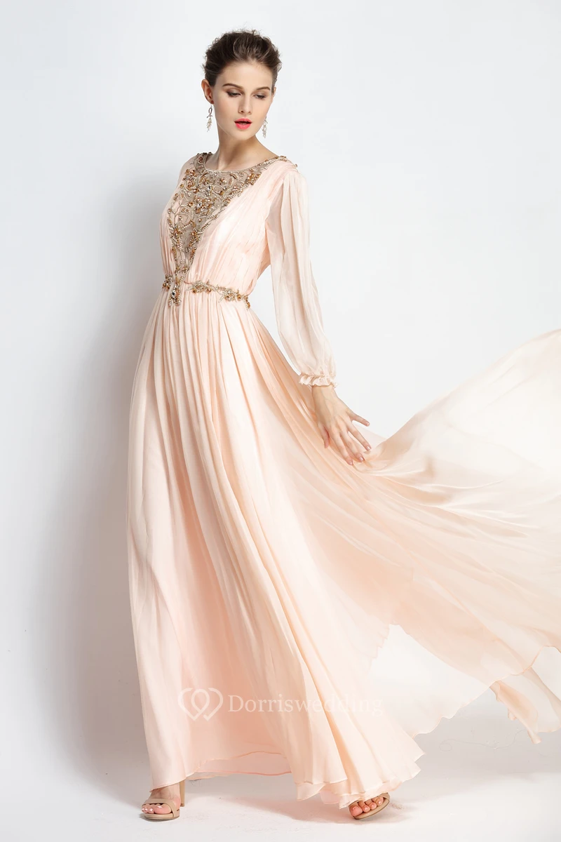 A-Line Floor-length Sweep Brush Train Bateau Chiffon Long Sleeve Prom Dress with Beading and Pleats