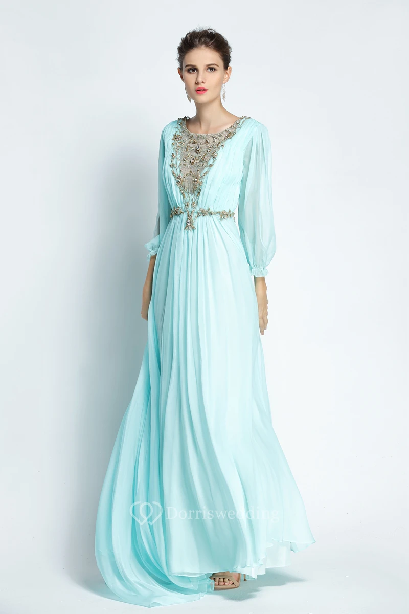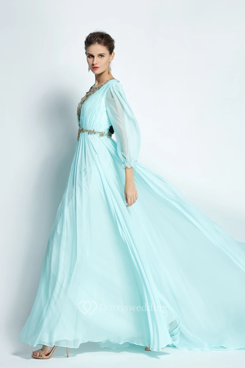 A-Line Floor-length Sweep Brush Train Bateau Chiffon Long Sleeve Prom Dress with Beading and Pleats