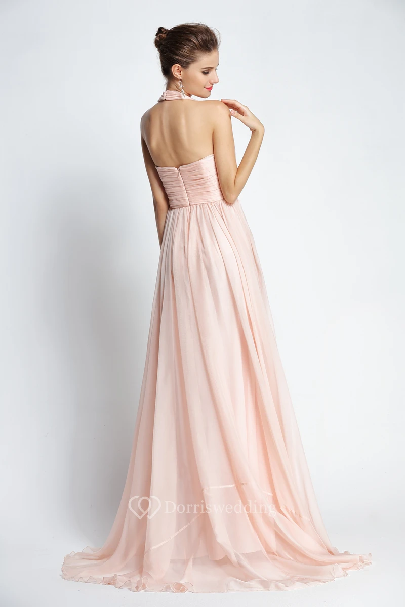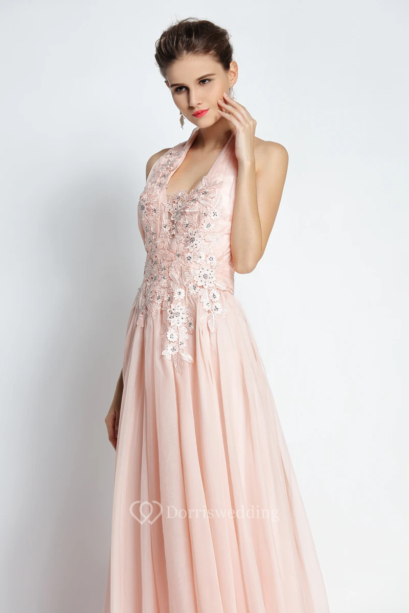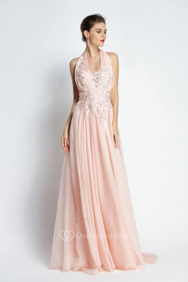 A-Line Floor-length Sweep Brush Train Halter Chiffon Sleeveless Prom Dress with Appliques and Pleats