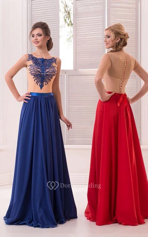 A-Line Floor-Length Sweep Jewel Sleeveless Chiffon Beading Pleats Button Dress