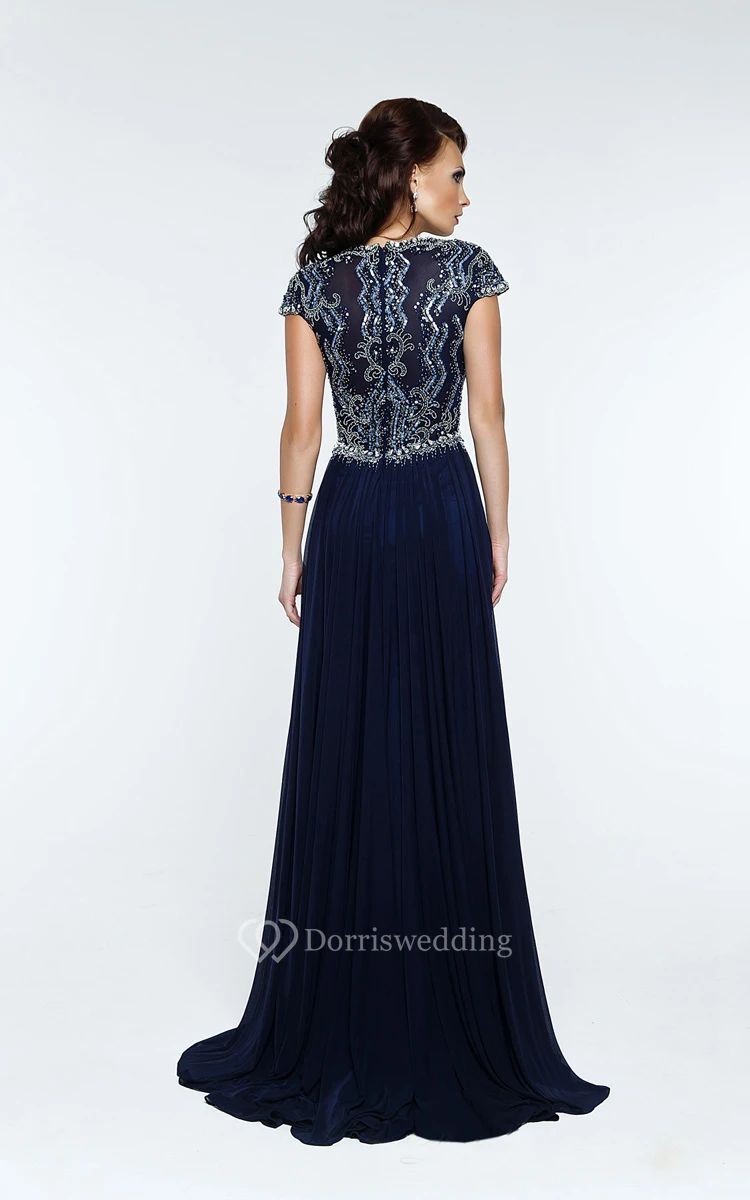 A-Line Floor-Length Sweep Queen Anne Short Sleeve Chiffon Beading Pleats Zipper Dress