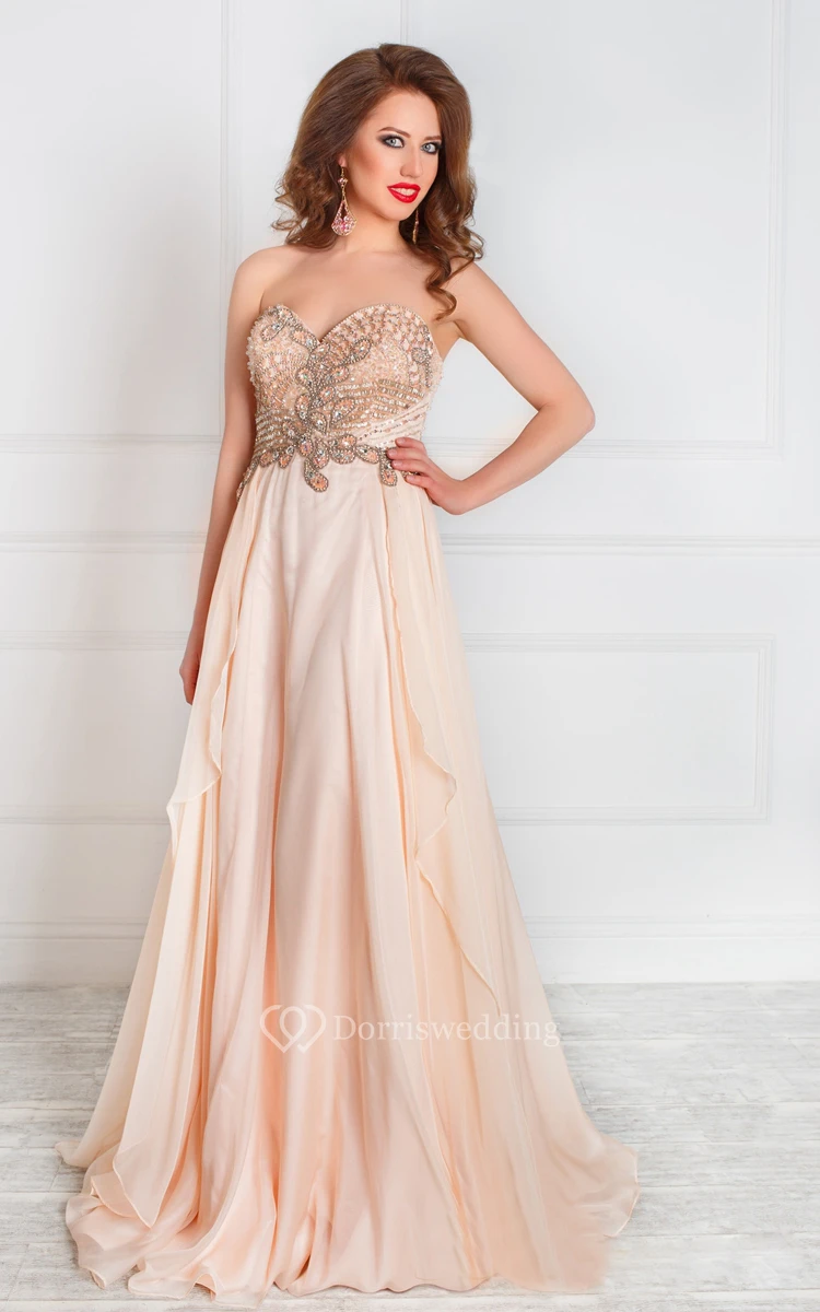 A-Line Floor-Length Sweep Sweetheart Sleeveless Chiffon Beading Ruffles Zipper Dress