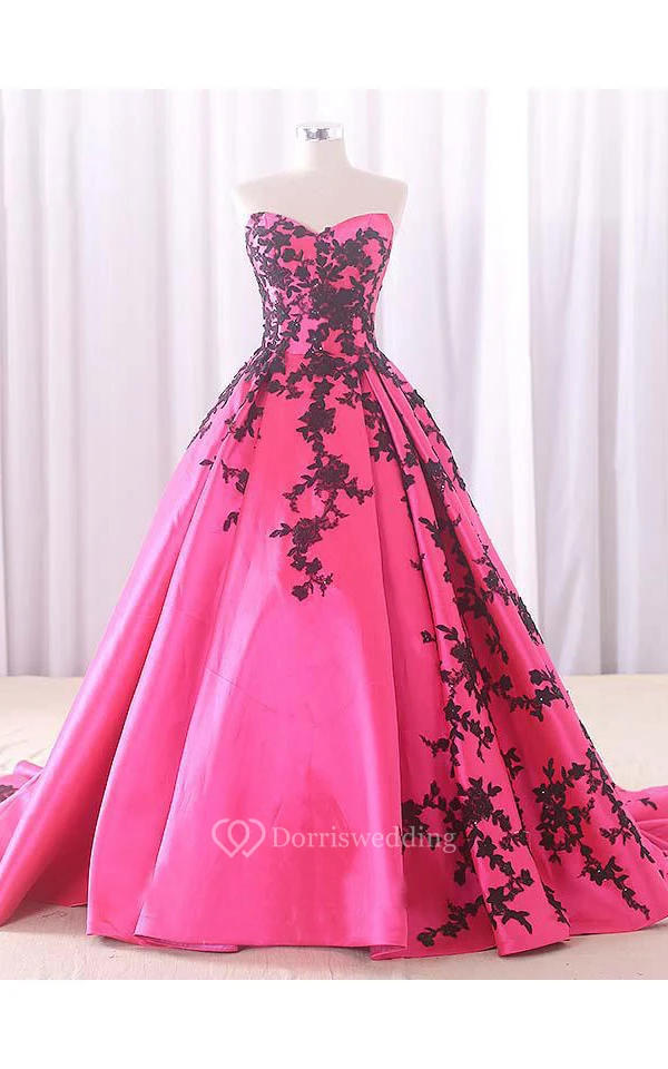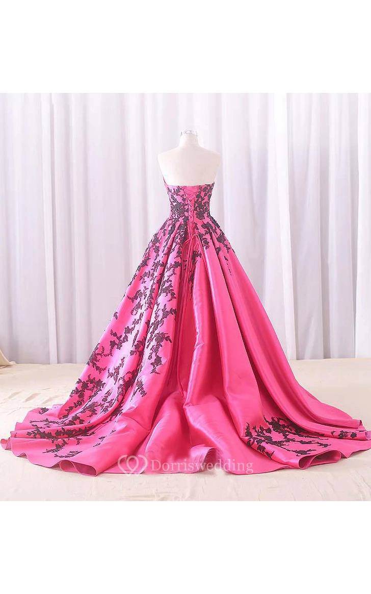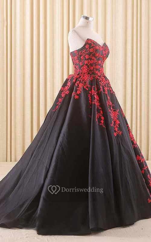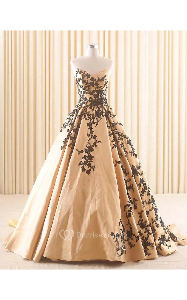 A-Line Floor-Length Sweetheart Appliques Chapel Train Zipper Corset Back Lace Satin Dress