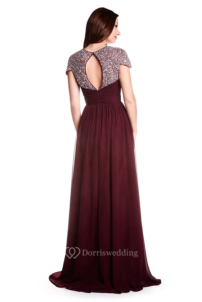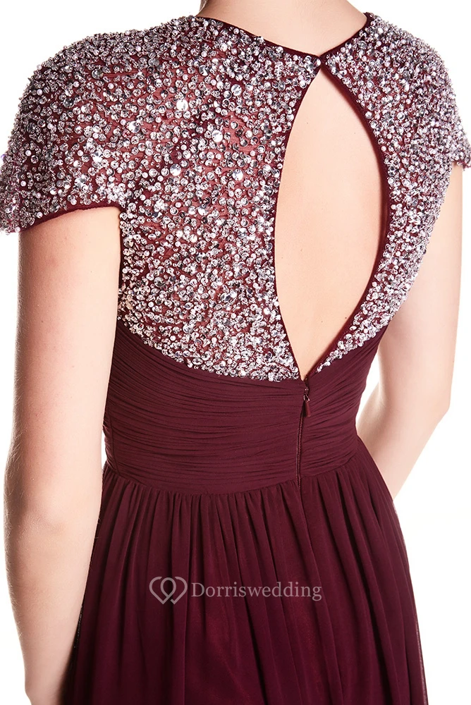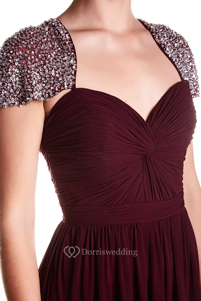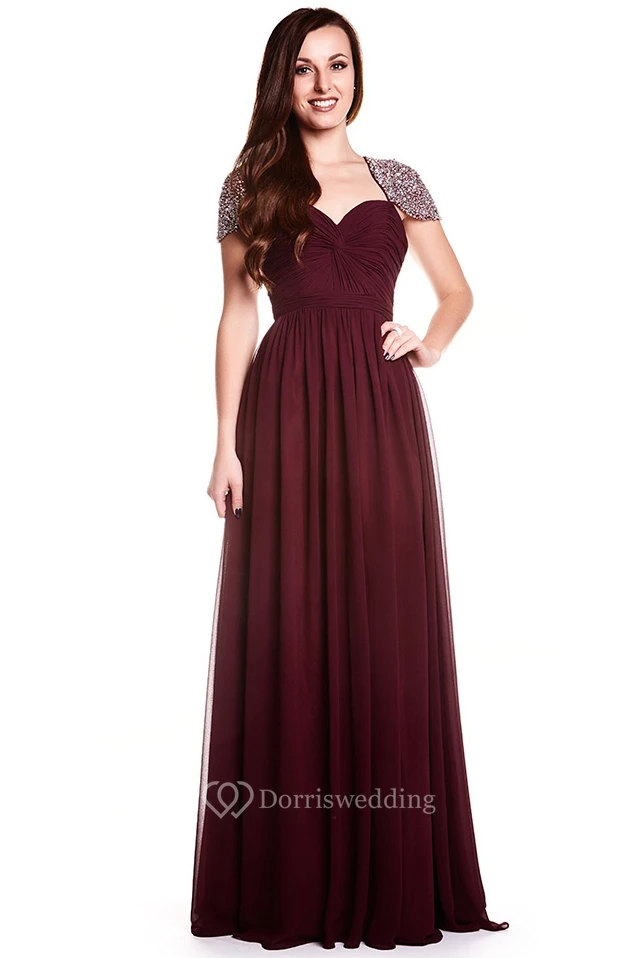 A-Line Floor-Length Sweetheart Criss-Cross Cap-Sleeve Chiffon Prom Dress With Keyhole Back And Beading