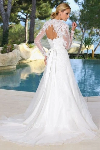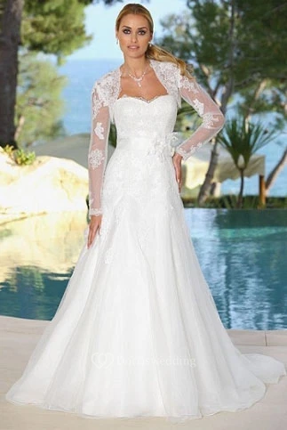 A-Line Floor-Length Sweetheart Long-Sleeve Appliqued Tulle Wedding Dress With Flower And Court Train