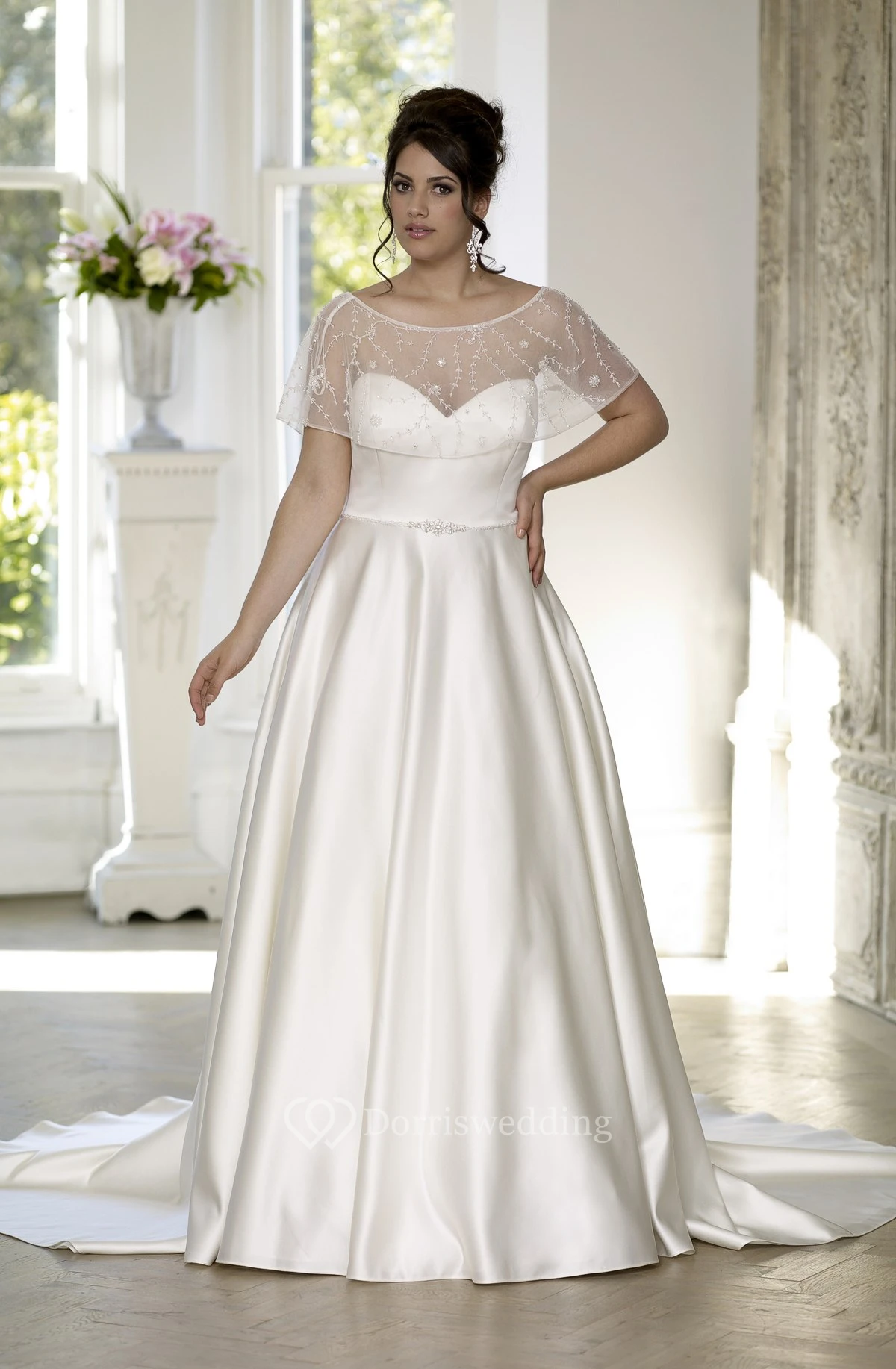 A-Line Floor-Length Sweetheart Satin Court Train Lace-Up Back Cape Dress
