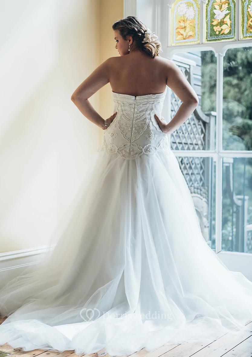 A-Line Floor-Length Sweetheart Sleeveless Tulle Court Train Backless Beading Dress