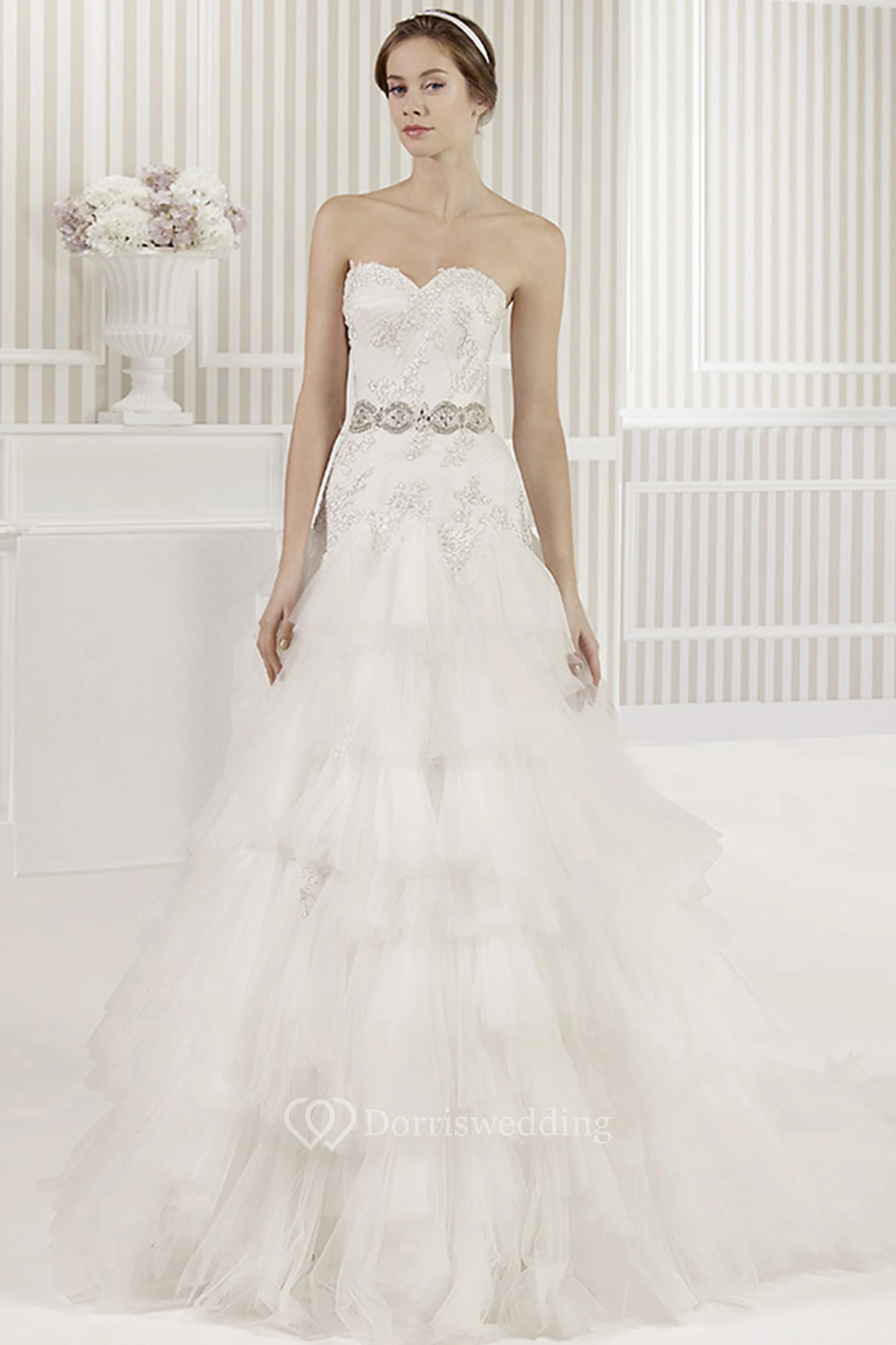 A-Line Floor-Length Sweetheart Tiered Tulle Wedding Dress With Beading And Corset Back