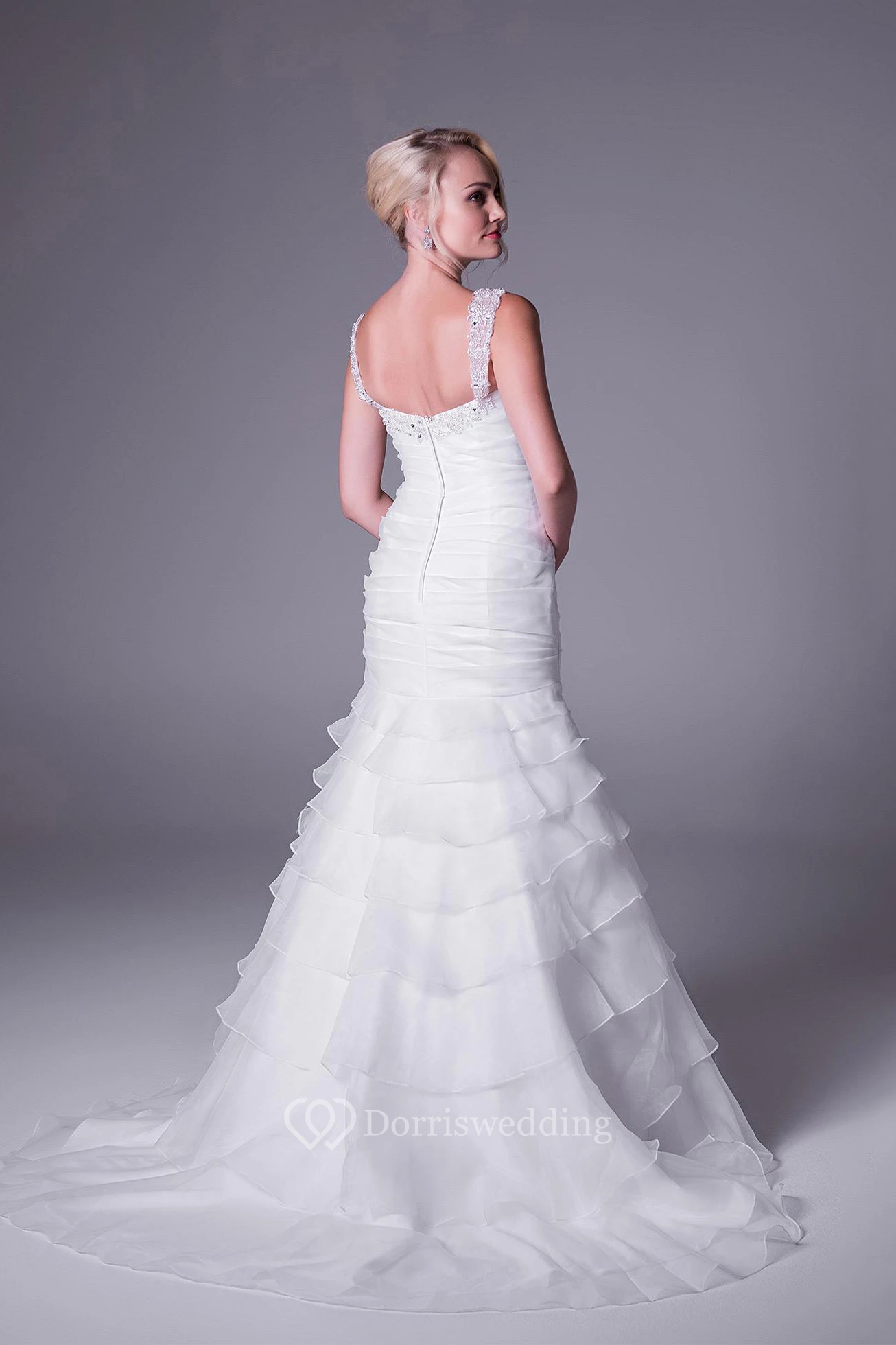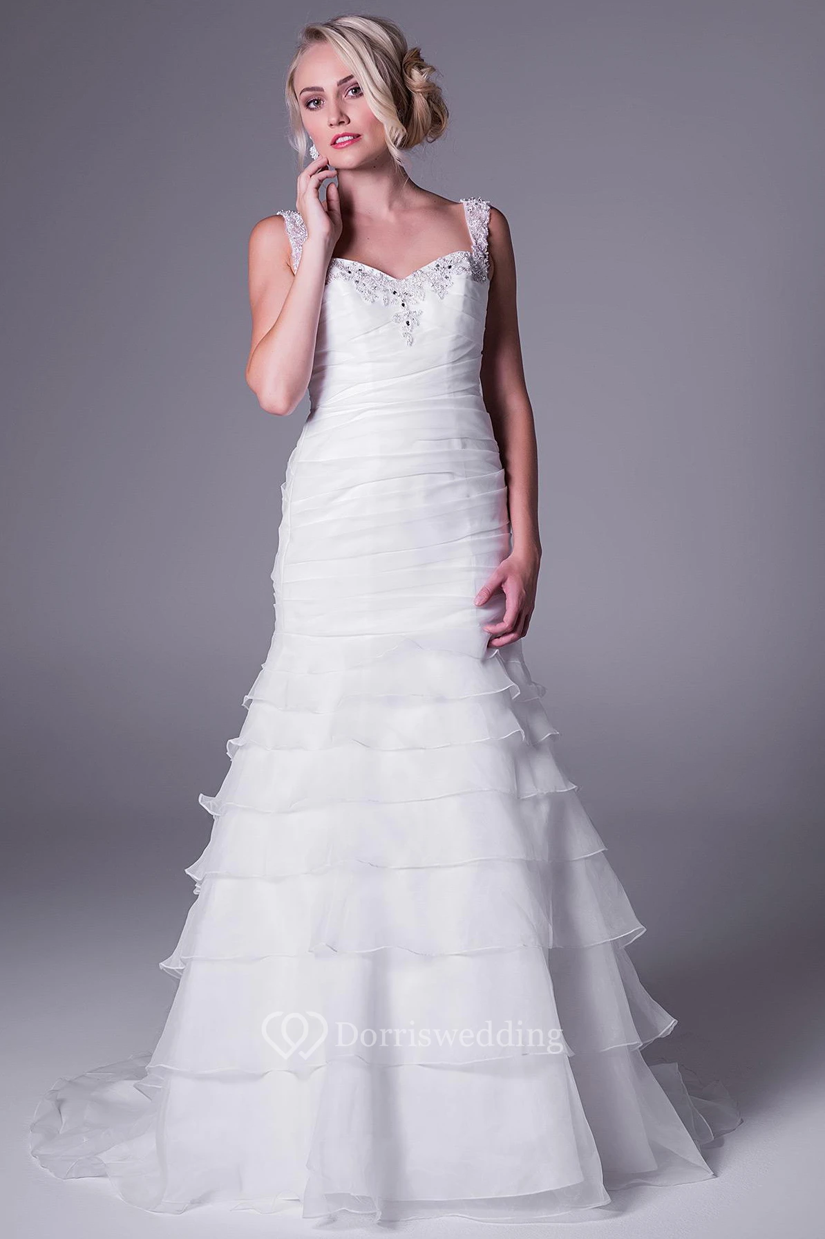 A-Line Floor-Length Tiered Sleeveless Strapped Organza Wedding Dress With Beading