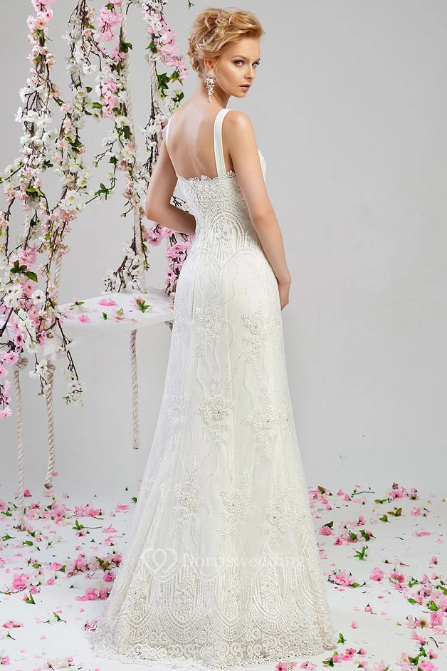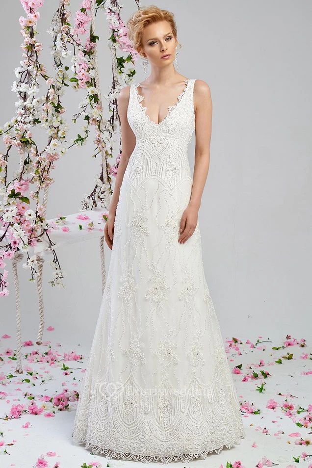 A-Line Floor-Length V-Neck Beaded Sleeveless Lace Wedding Dress