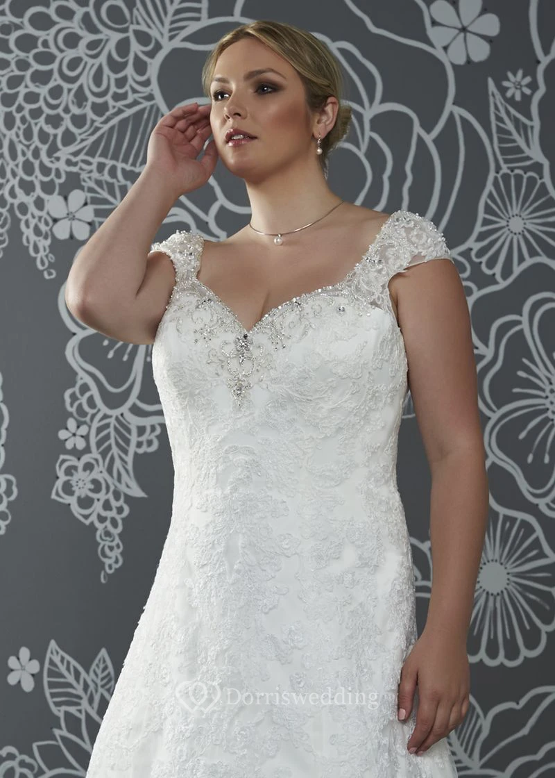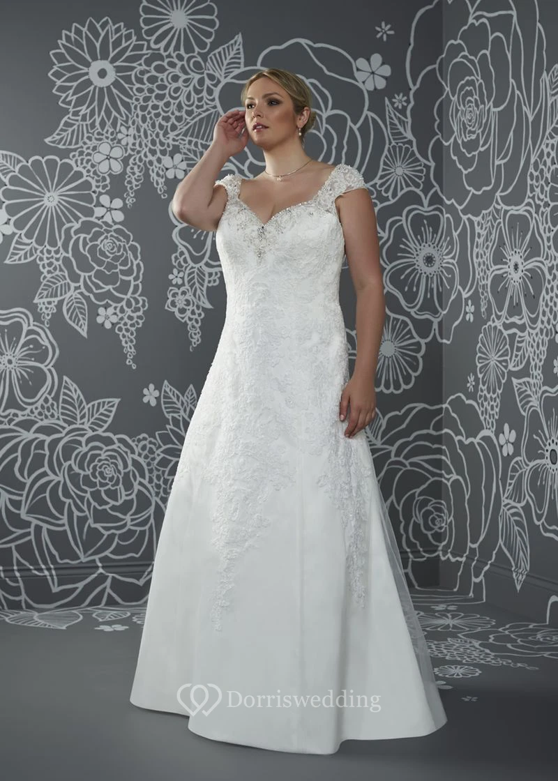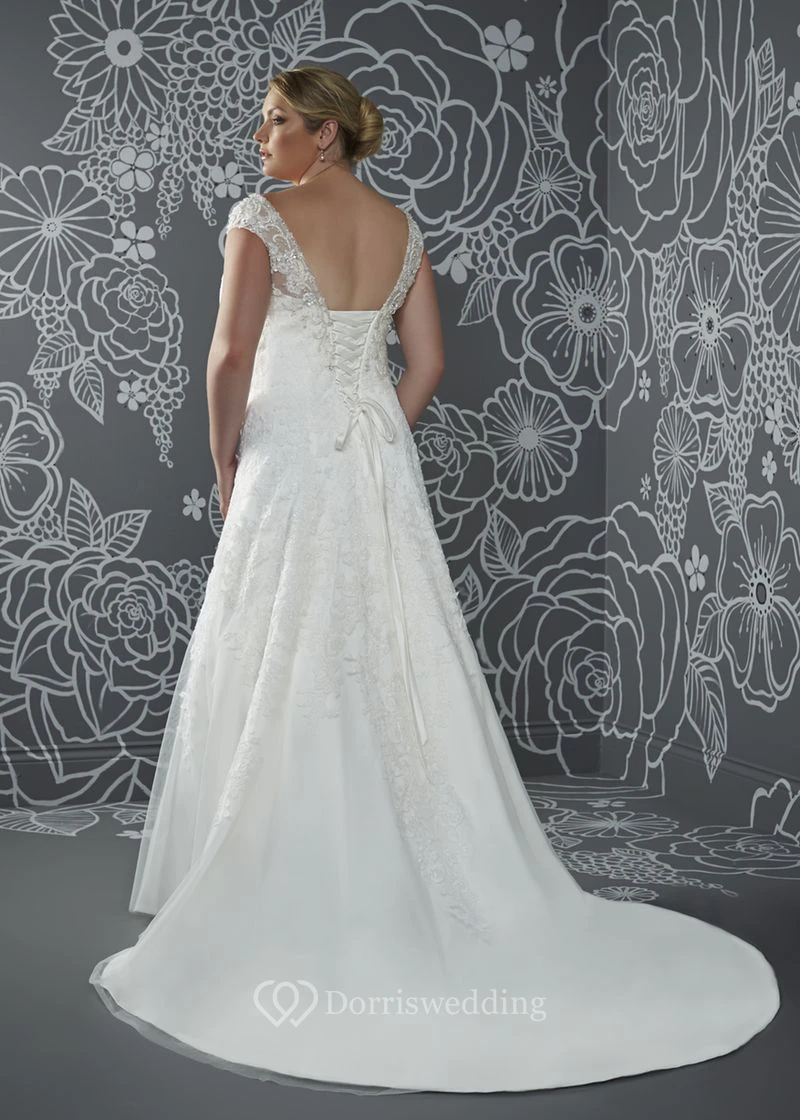 A-Line Floor-Length V-Neck Cap Satin Court Train Lace-Up Back Appliques Dress