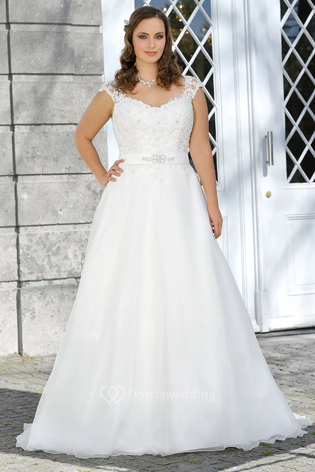 A-Line Floor-Length V-Neck Cap Satin Sweep Train Appliques Dress