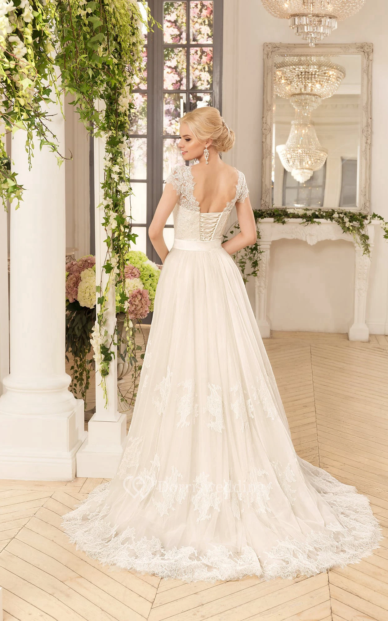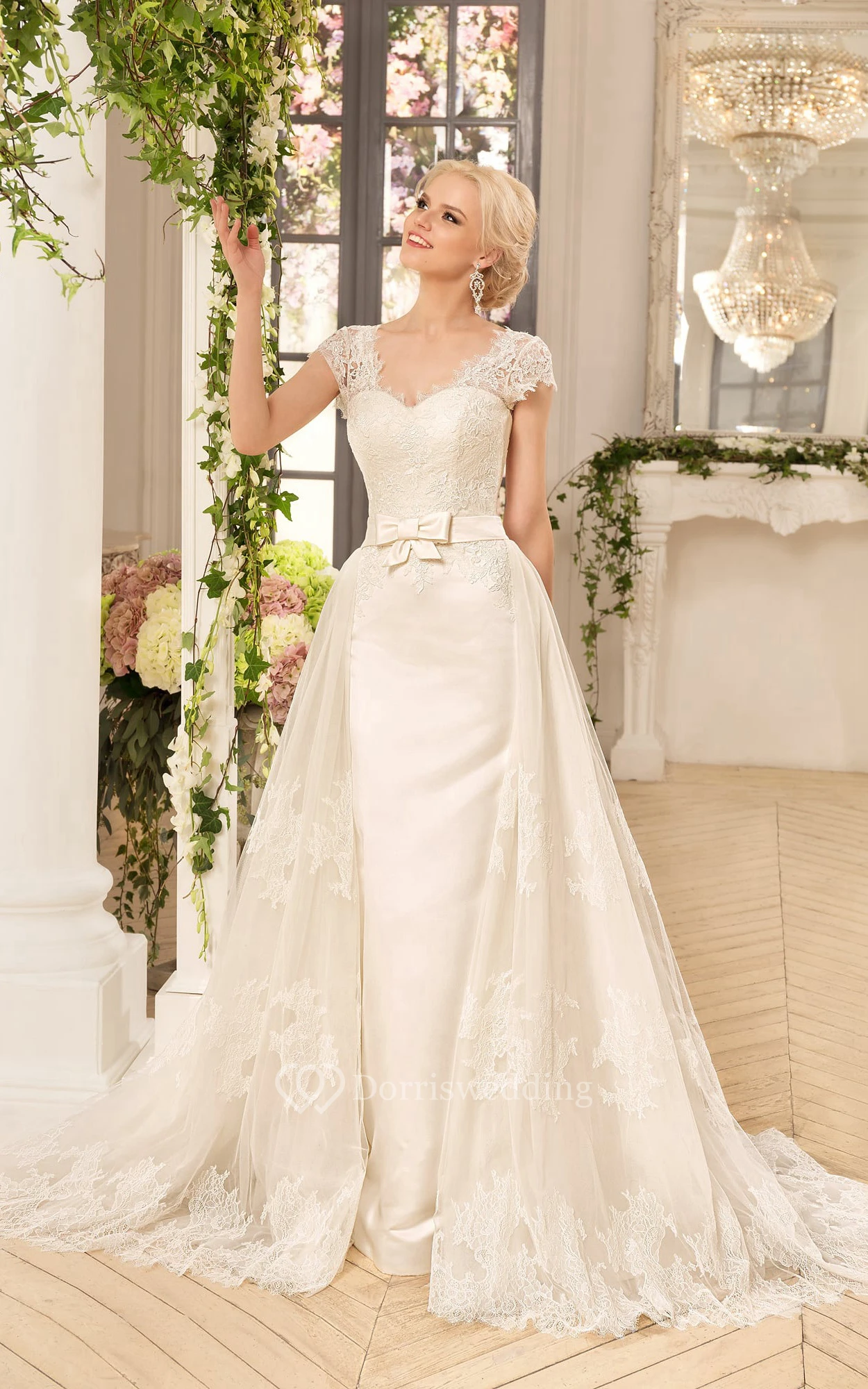 A-Line Floor-Length V-Neck Cap-Sleeve Corset-Back Lace Satin Dress With Appliques And Bow