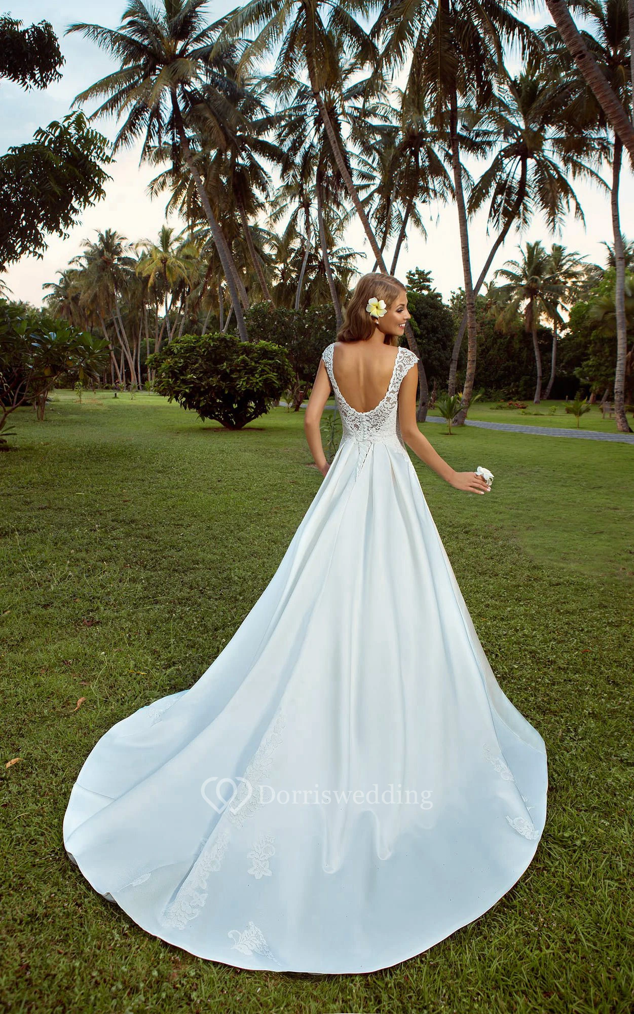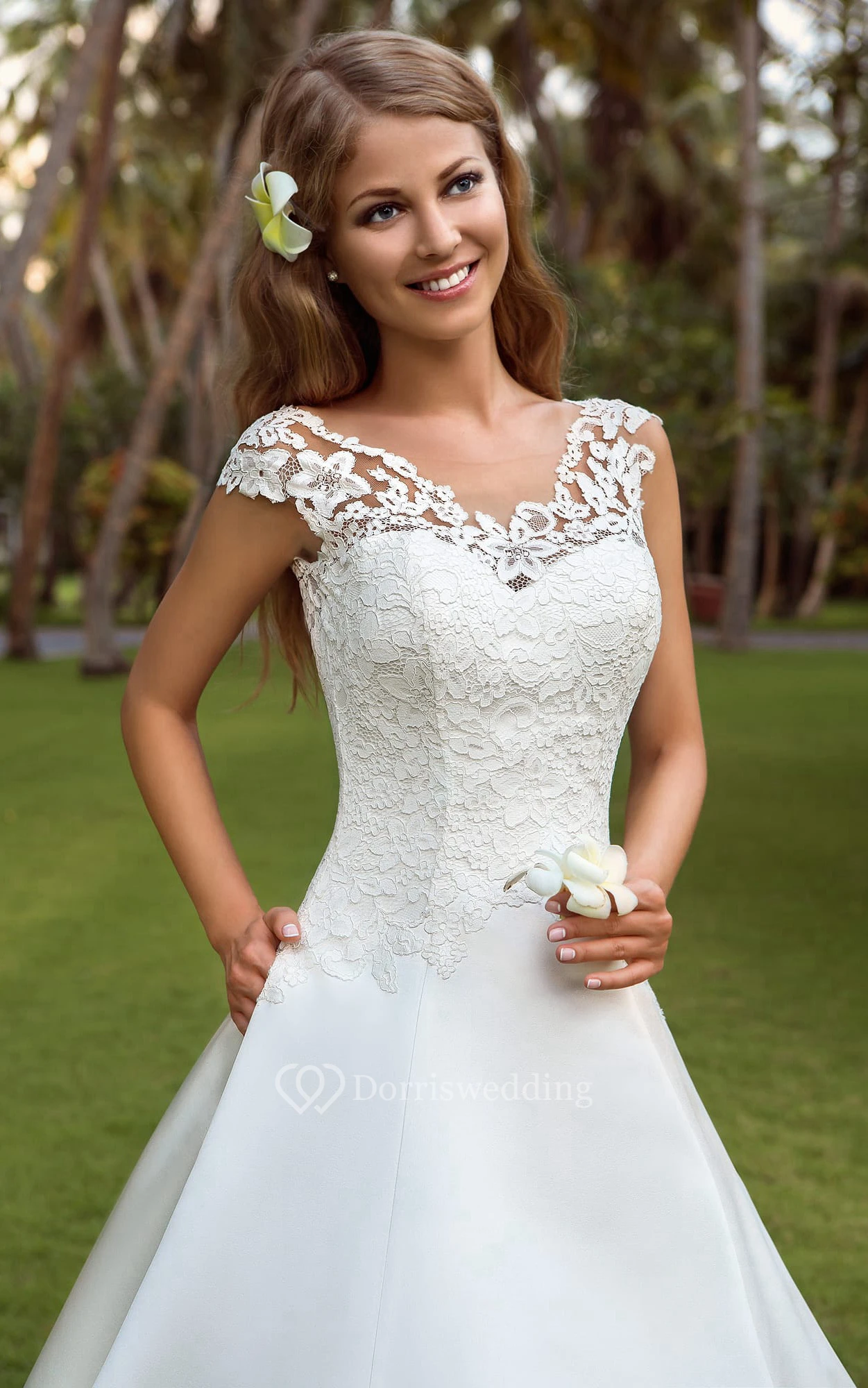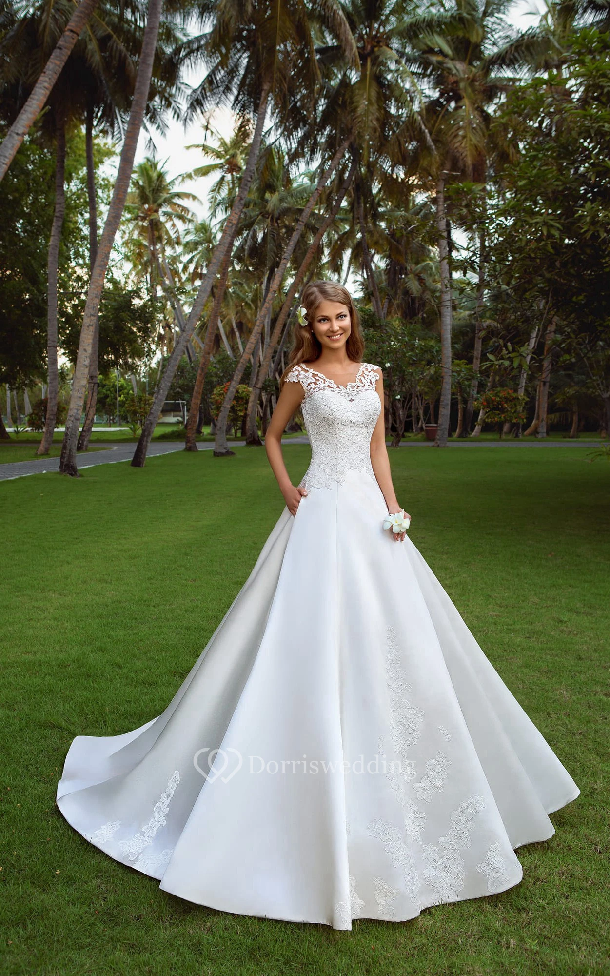 A-Line Floor-Length V-Neck Cap-Sleeve Corset-Back Satin Dress With Appliques