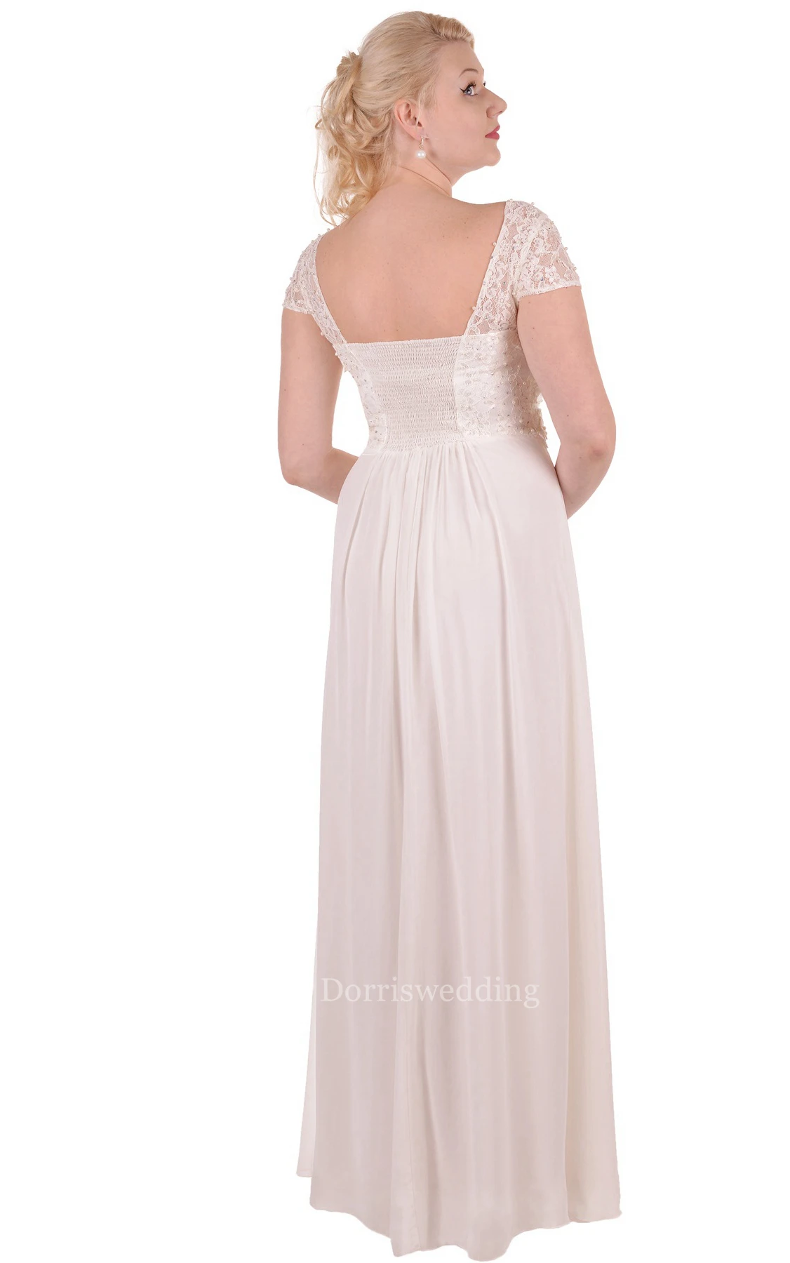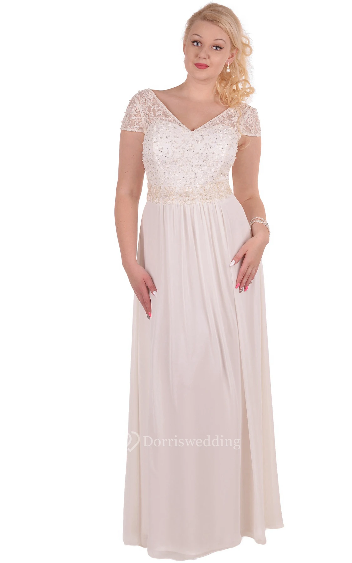 A-Line Floor-Length V-Neck Short Sleeve Chiffon Appliques Dress