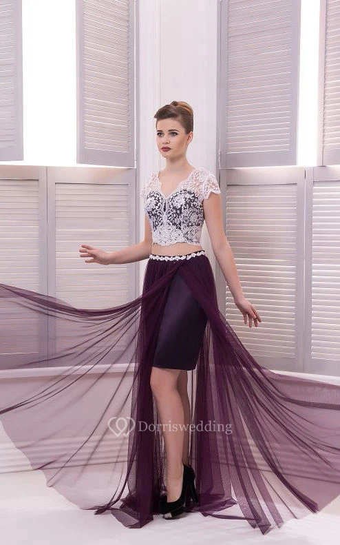 A-Line Floor-Length V-Neck Short Sleeve Chiffon Lace Beading Zipper Dress