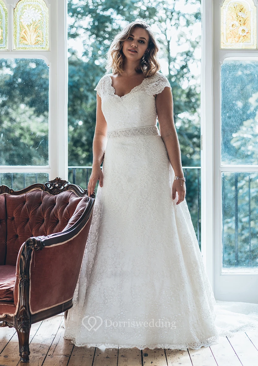 A-Line Floor-Length V-Neck Short Sleeve Lace Sweep Train Low-V Back Waist Jewellery Dress