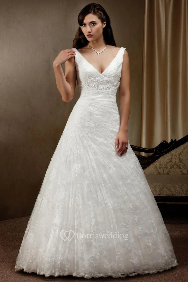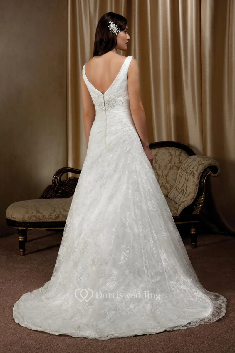 A-Line Floor-Length V-Neck Side-Draped Sleeveless Lace Wedding Dress With Appliques And Low-V Back