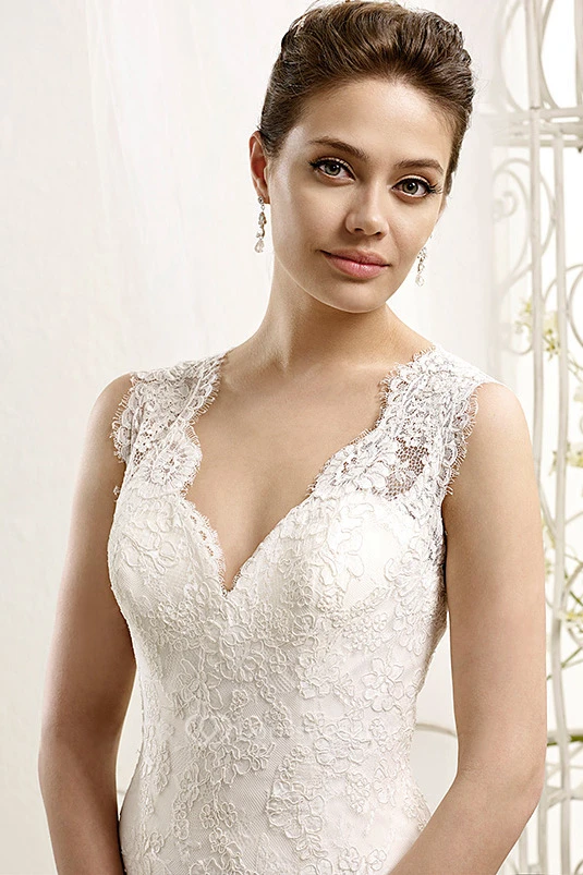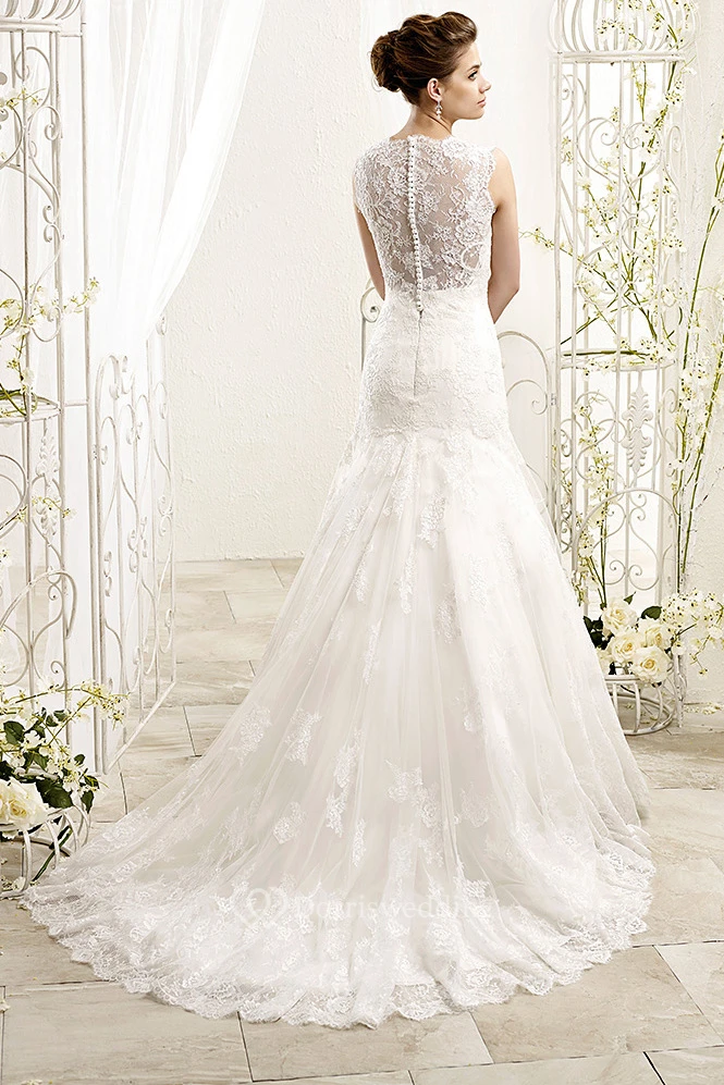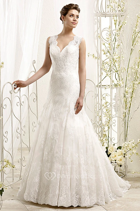 A-Line Floor-Length V-Neck Sleeveless Appliqued Lace Wedding Dress With Pleats