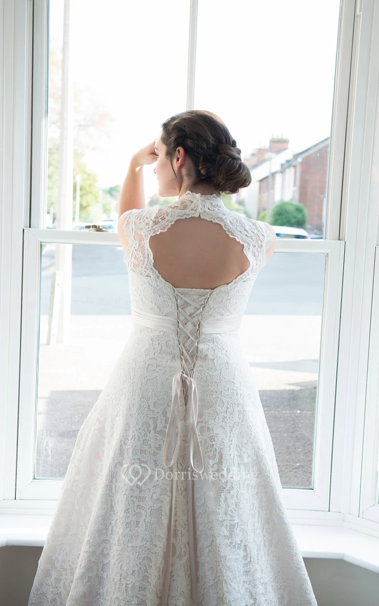 A-Line Floor-Length V-Neck Sleeveless Lace Flower Court Train Keyhole Flower Bridal Dress