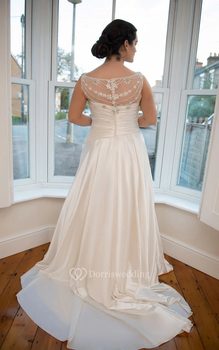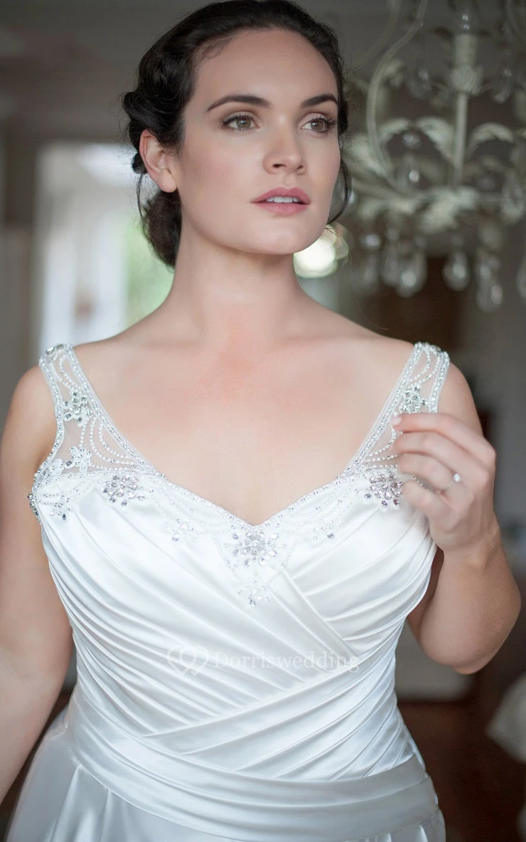 A-Line Floor-Length V-Neck Sleeveless Satin Court Train Illusion Ruching Dress
