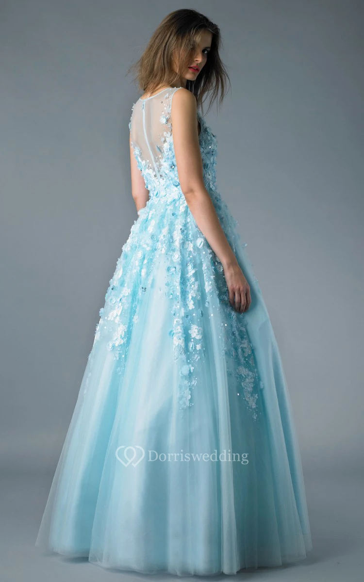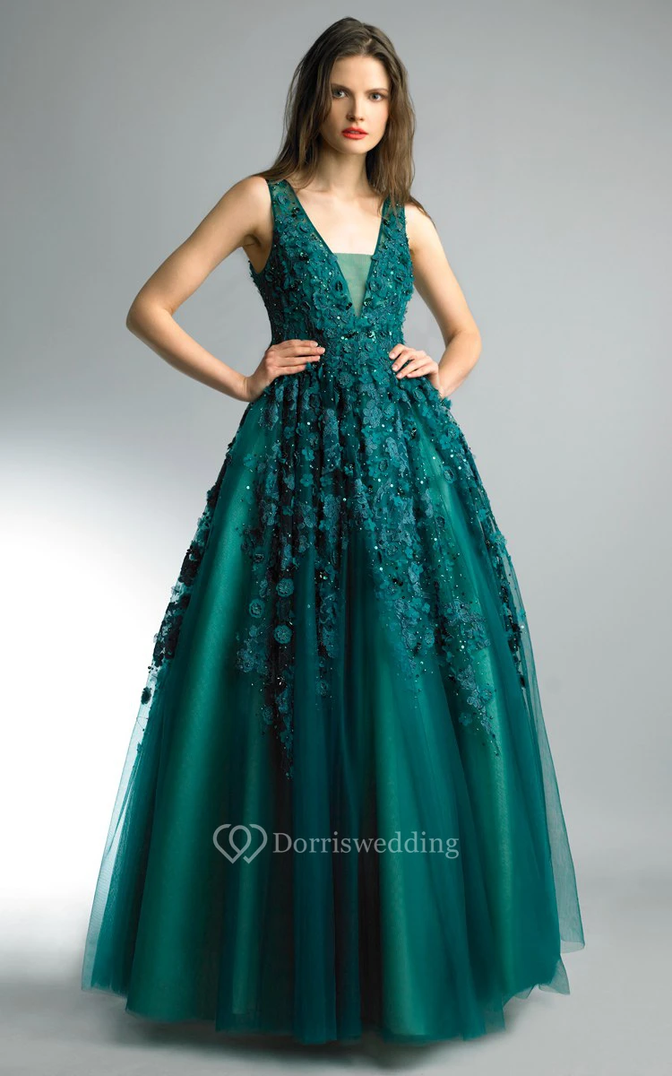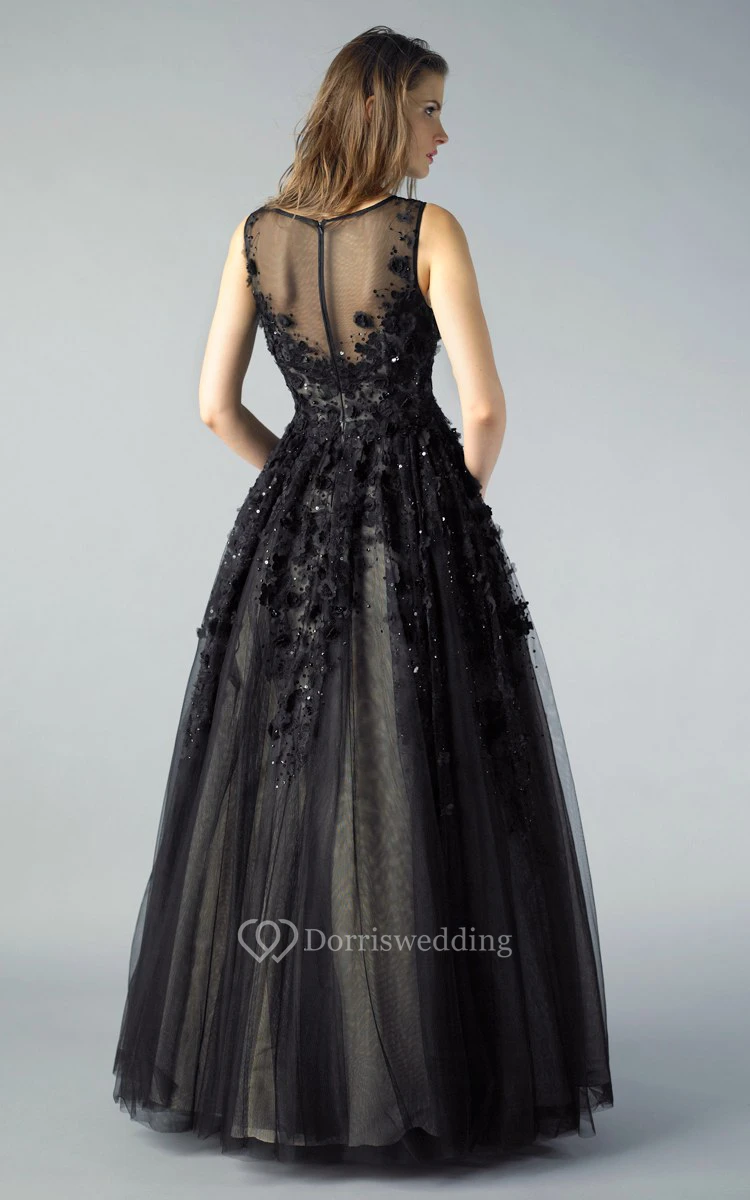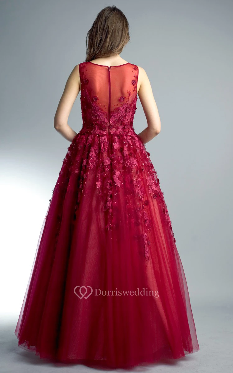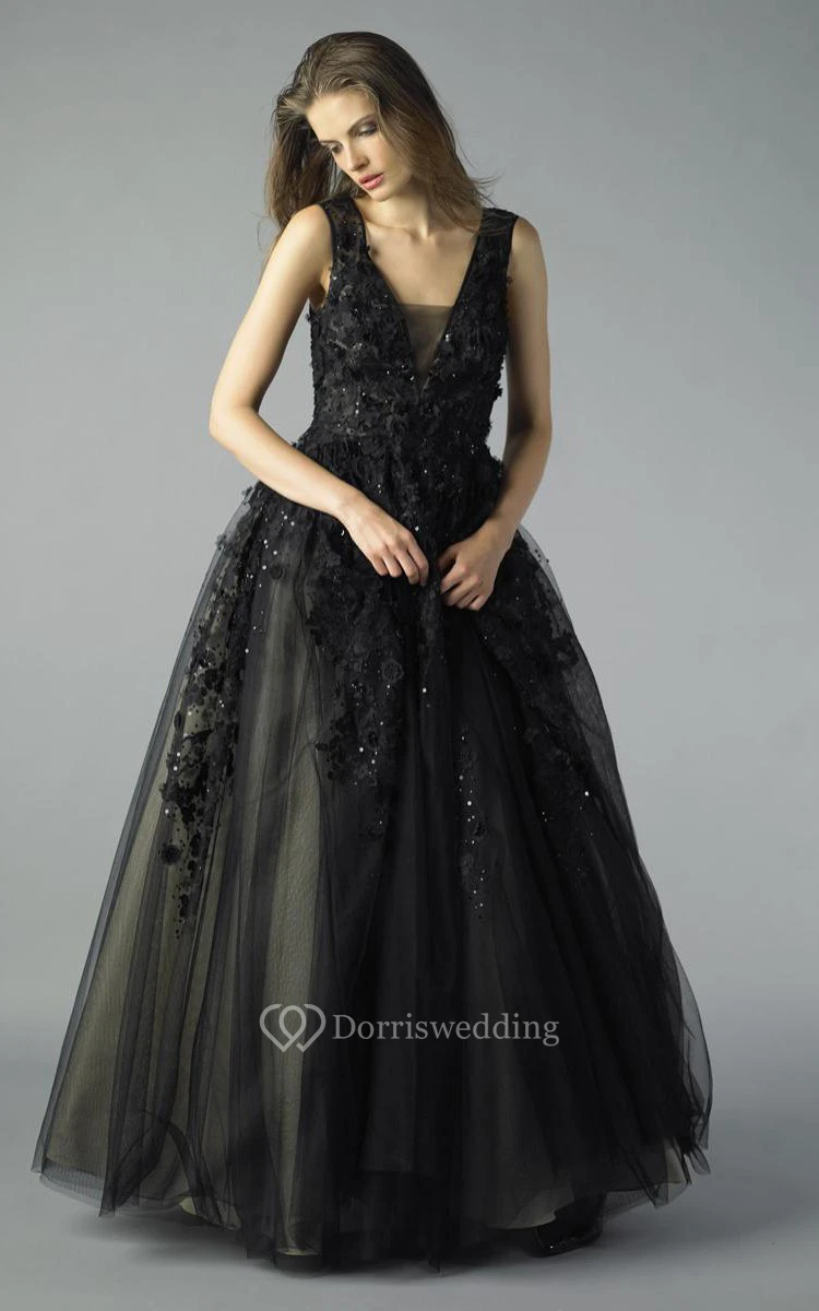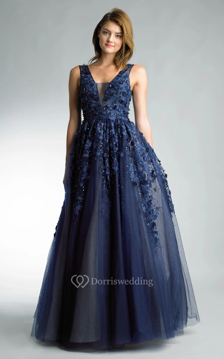A-line Floor-length V-neck Sleeveless Tulle Illusion Dress