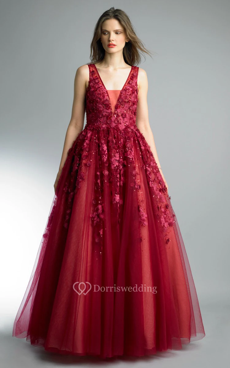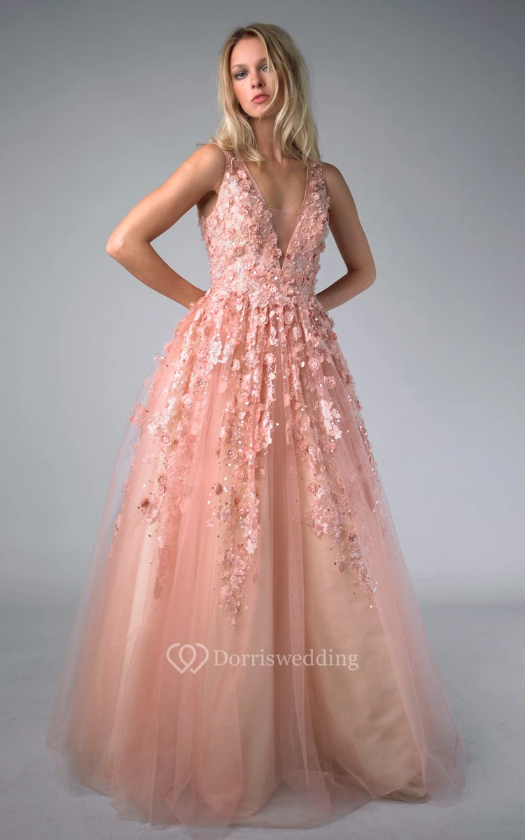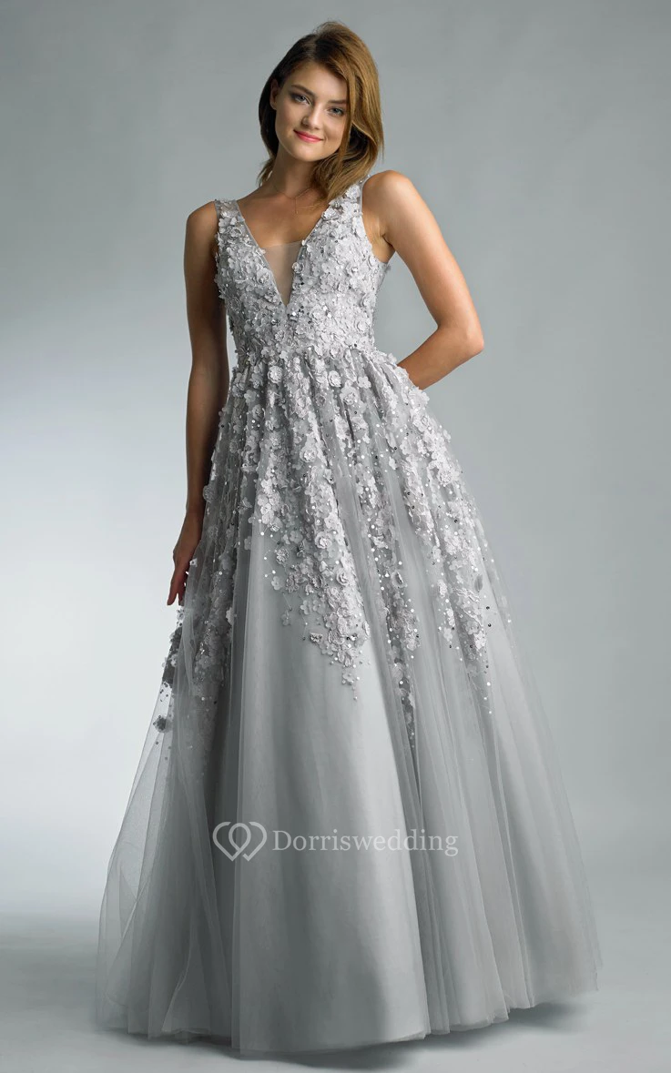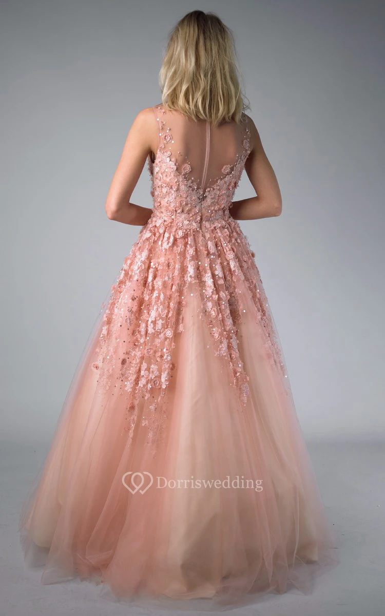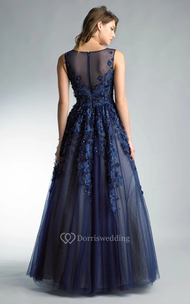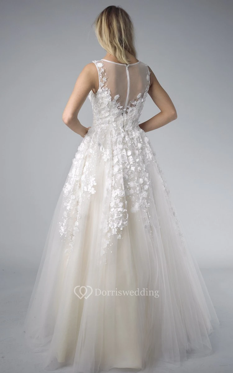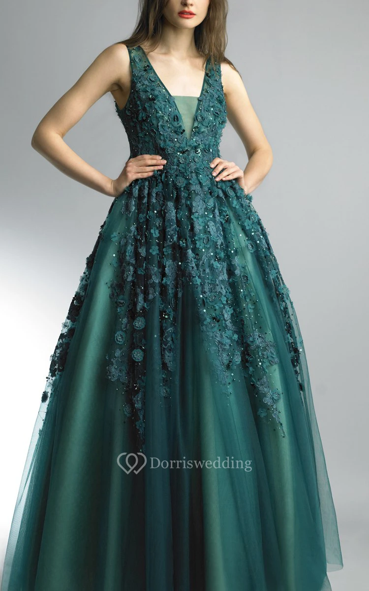 A-line Floor-length V-neck Sleeveless Tulle Illusion Dress