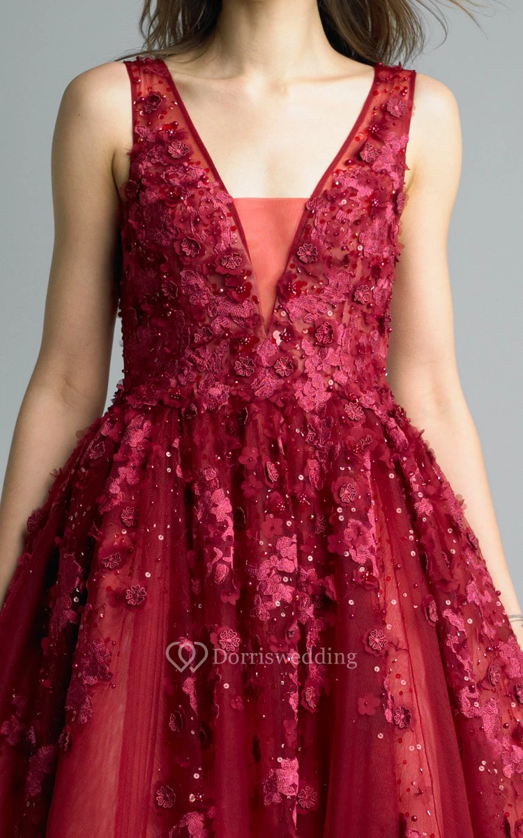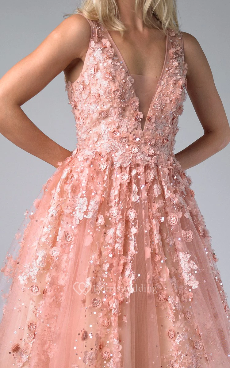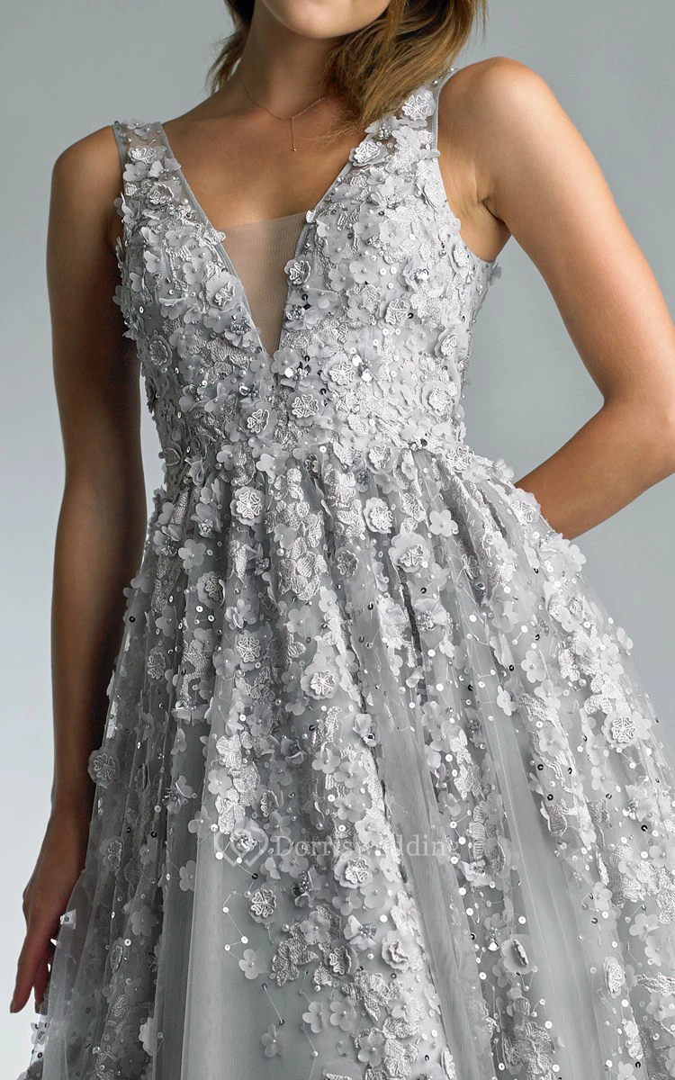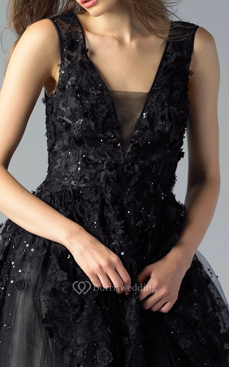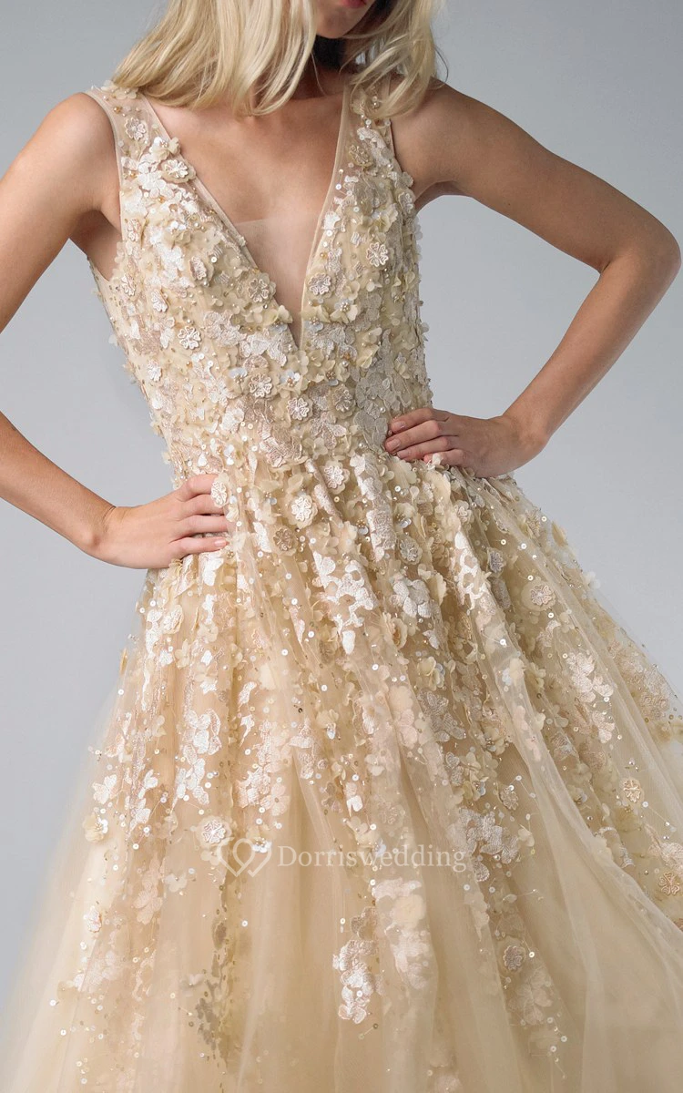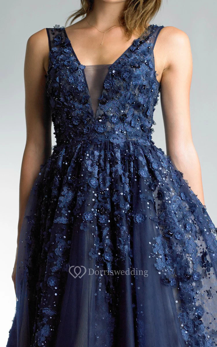 A-line Floor-length V-neck Sleeveless Tulle Illusion Dress