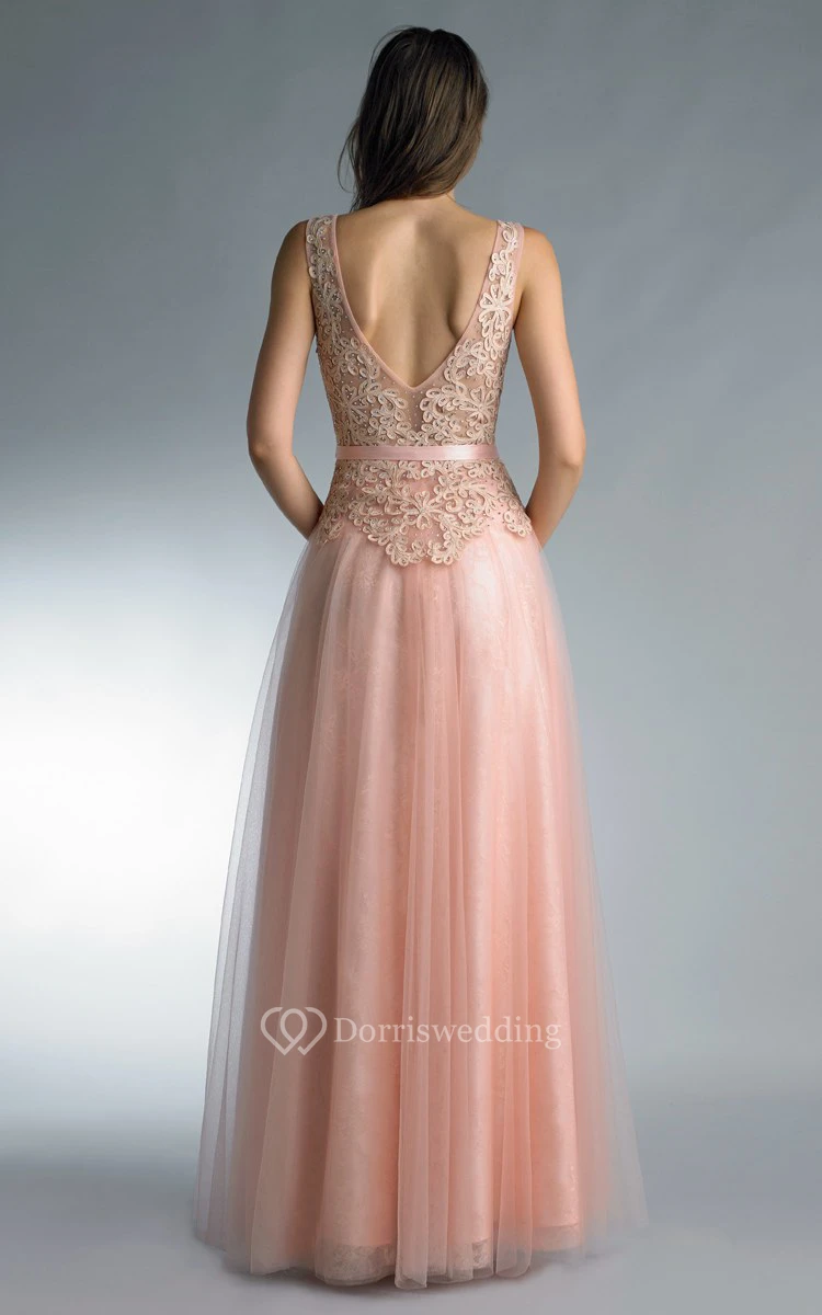 A-line Floor-length V-neck Sleeveless Tulle Low-V Back Dress