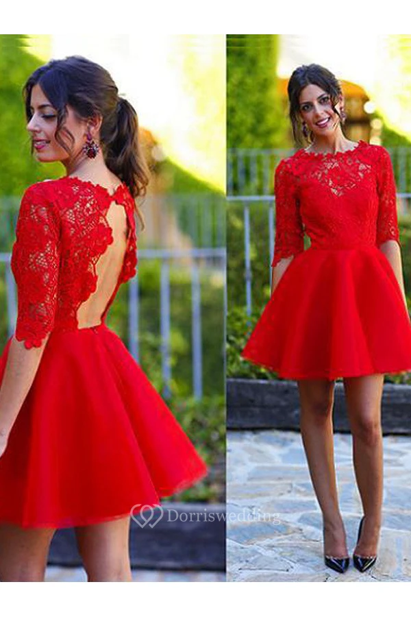 A-line Half Sleeve Satin Lace Jewel Scalloped Keyhole Short Mini Homecoming Dress