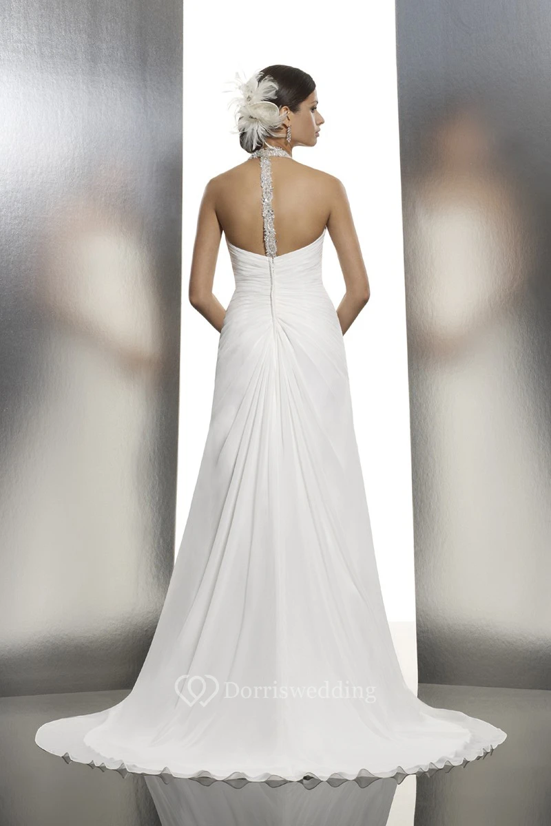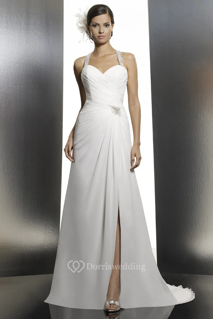A-Line Halter Floor-Length Sleeveless Ruched Chiffon Wedding Dress With Split Front