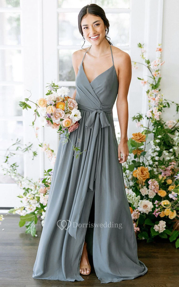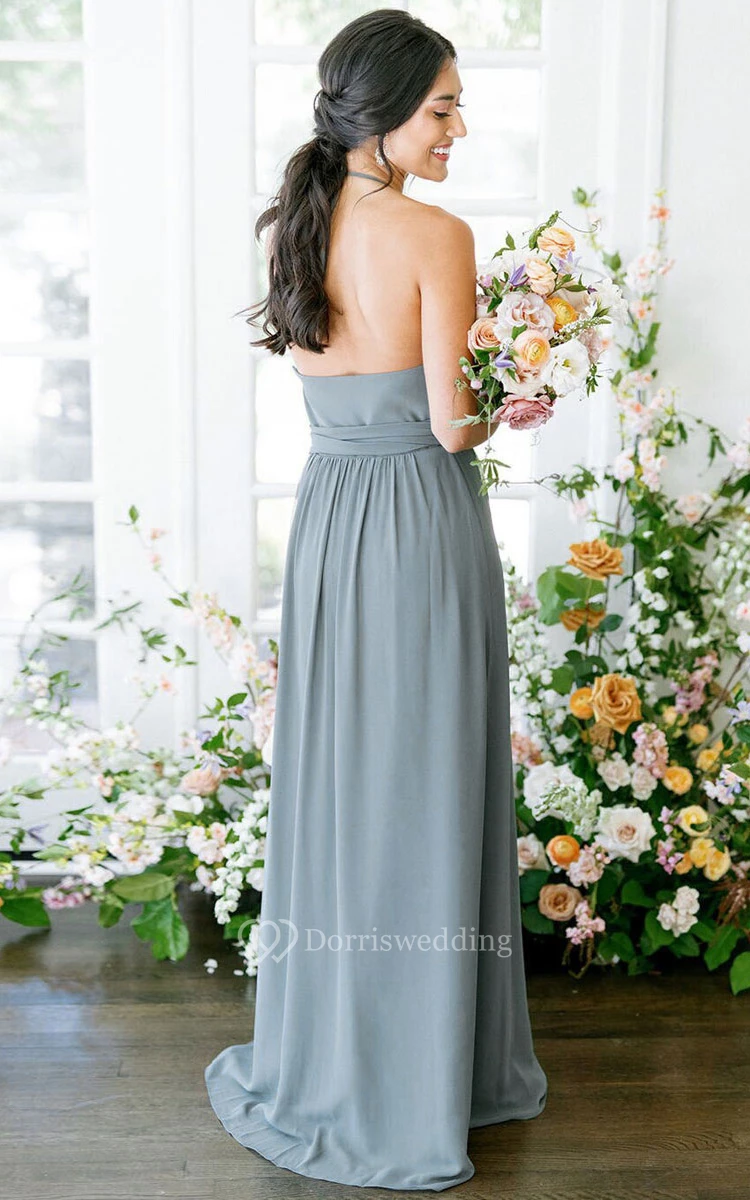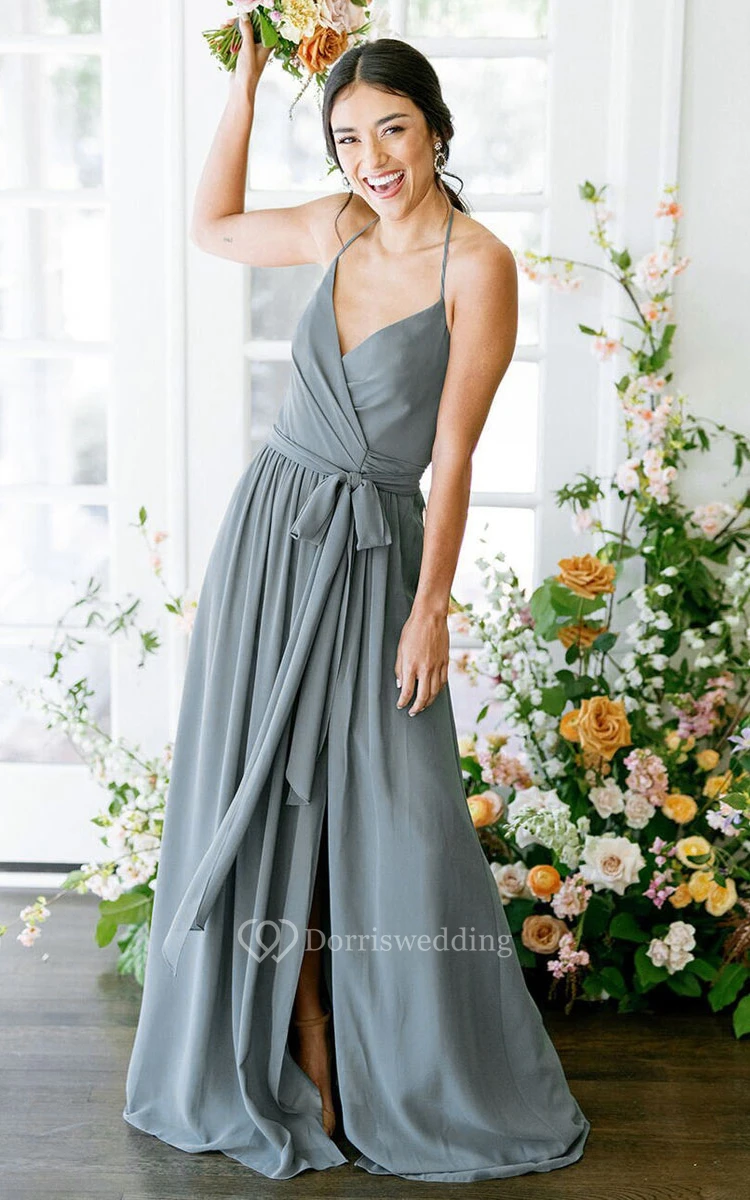 A-Line Halter Neckline Sleeveless Sweep Train Chiffon Satin Bridesmaid Dress with Sash and Front Slit