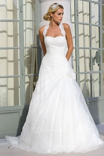 A-Line Halter Sleeveless Appliqued Floor-Length Tulle Wedding Dress With Flower And Draping
