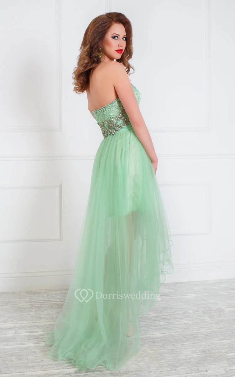 A-Line High-Low Asymmetrical Train Sweetheart Sleeveless Tulle Beading Ruffles Backless Dress