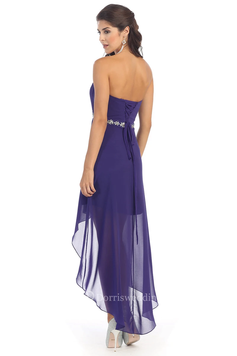 A-Line High-Low Strapless Chiffon Corset Back Dress With Ruching And Waist Jewellery