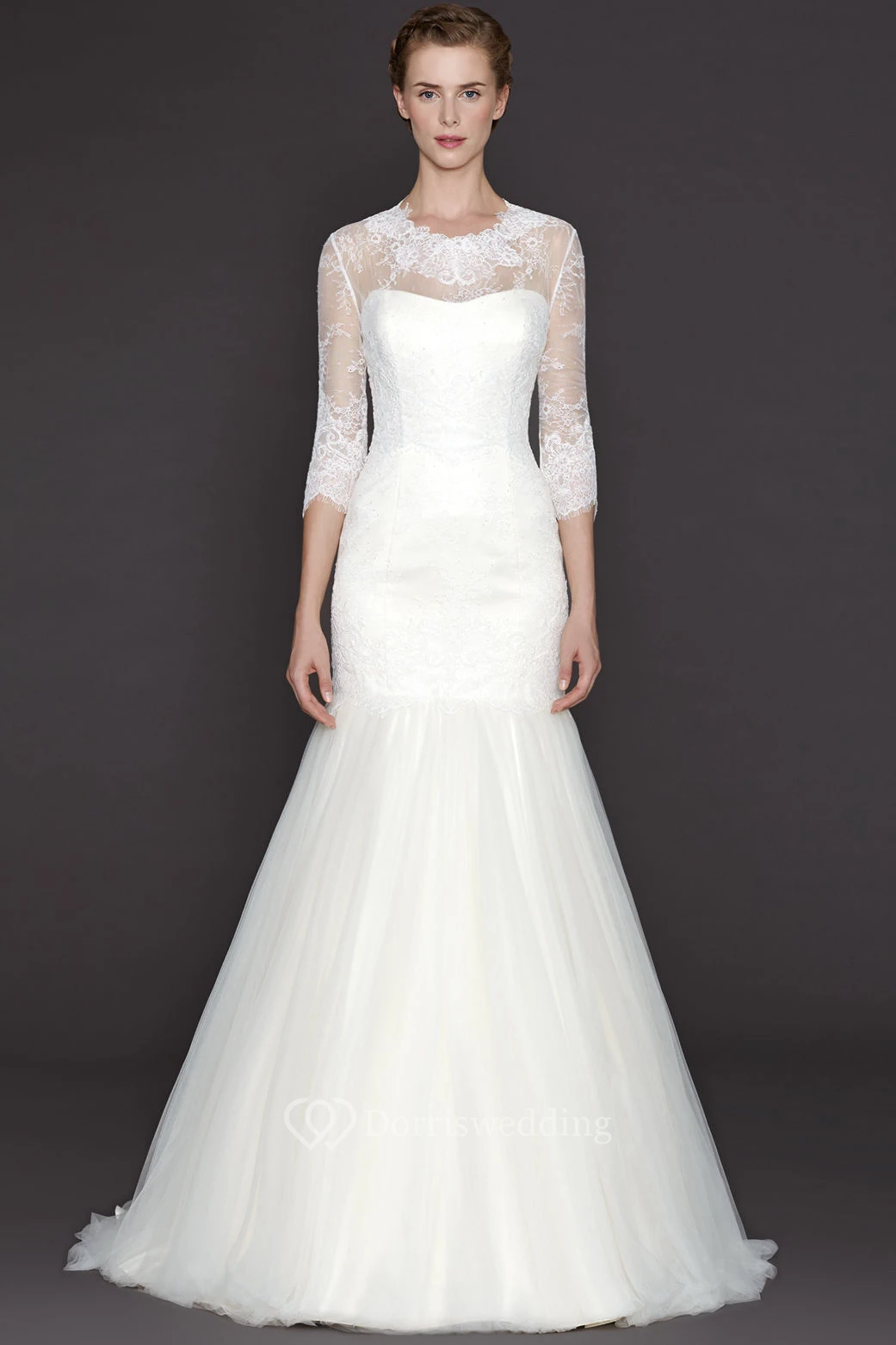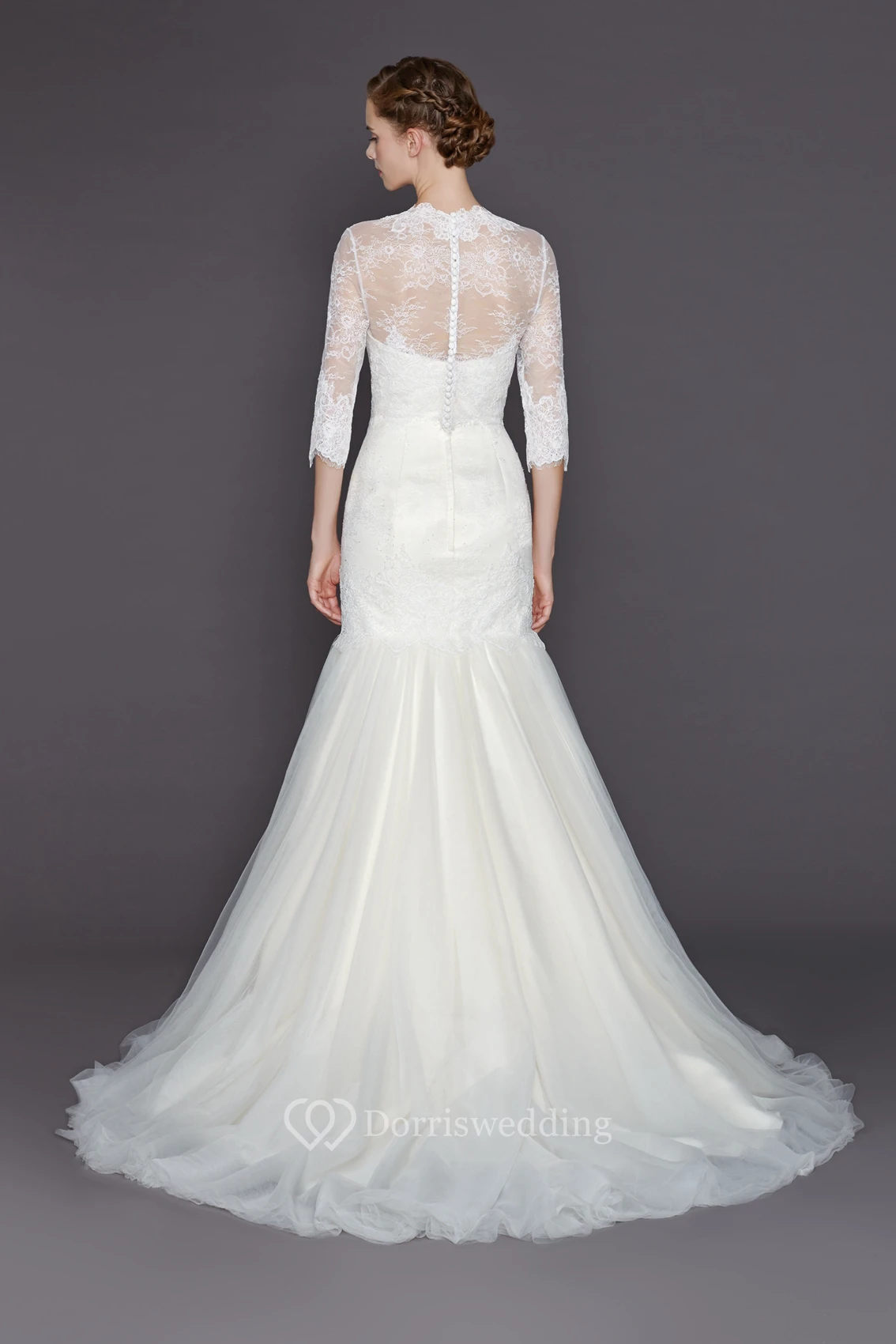 A-Line High Neck 3-4-Sleeve Long Tulle&Lace Wedding Dress With Appliques And Illusion