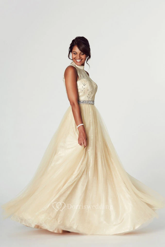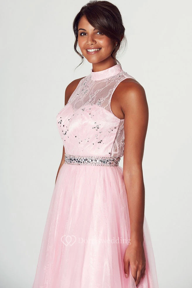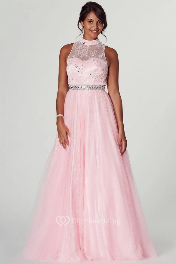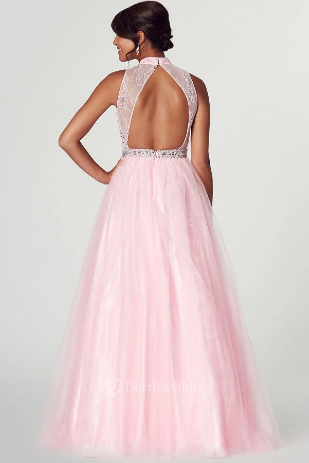 A-Line High Neck Appliqued Sleeveless Tulle Prom Dress