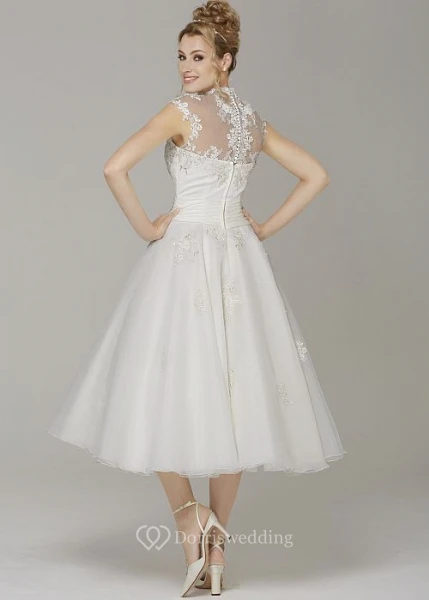 A-Line High Neck Cap-Sleeve Tea-Length Tulle Wedding Dress With Appliques And Illusion