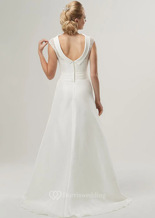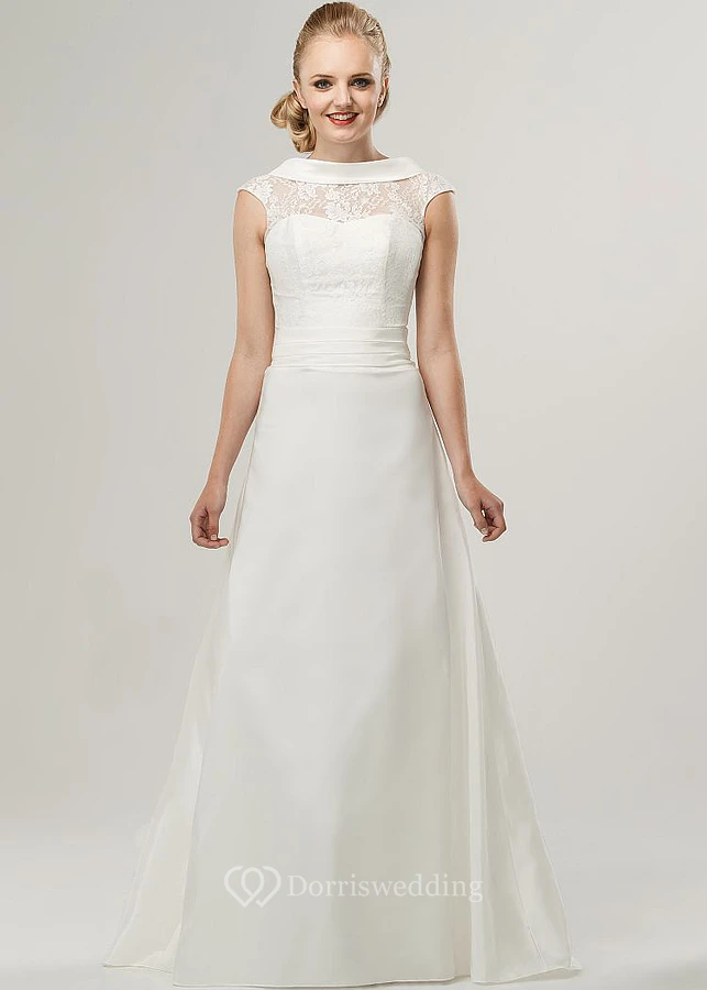 A-Line High-Neck Floor-Length Appliqued Cap-Sleeve Satin&Lace Wedding Dress