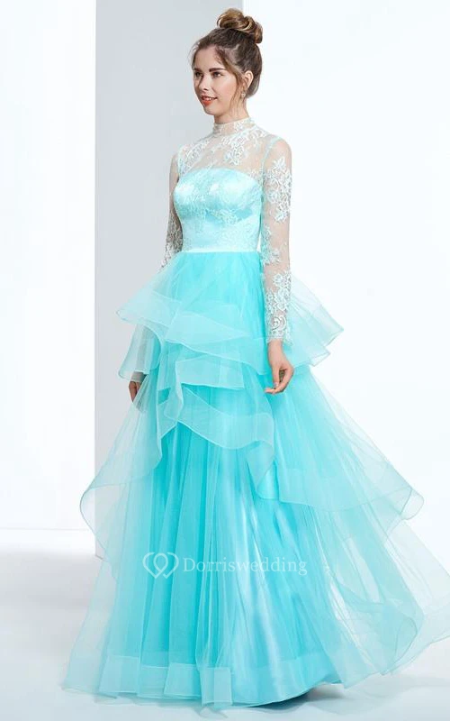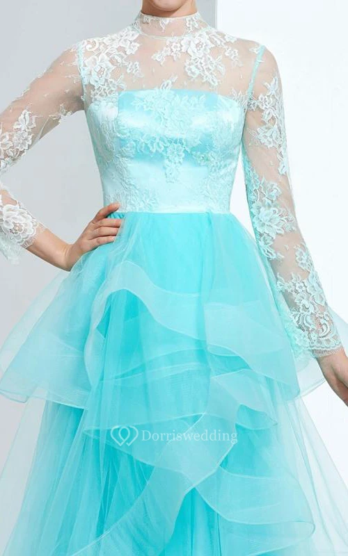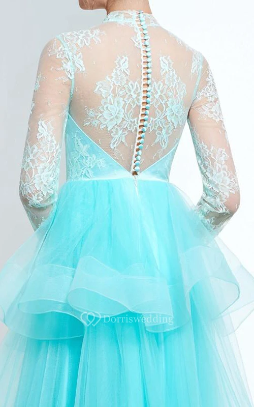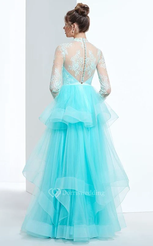A-Line High Neck Long Sleeves Button Lace Tiered Floor-Length Prom Dress