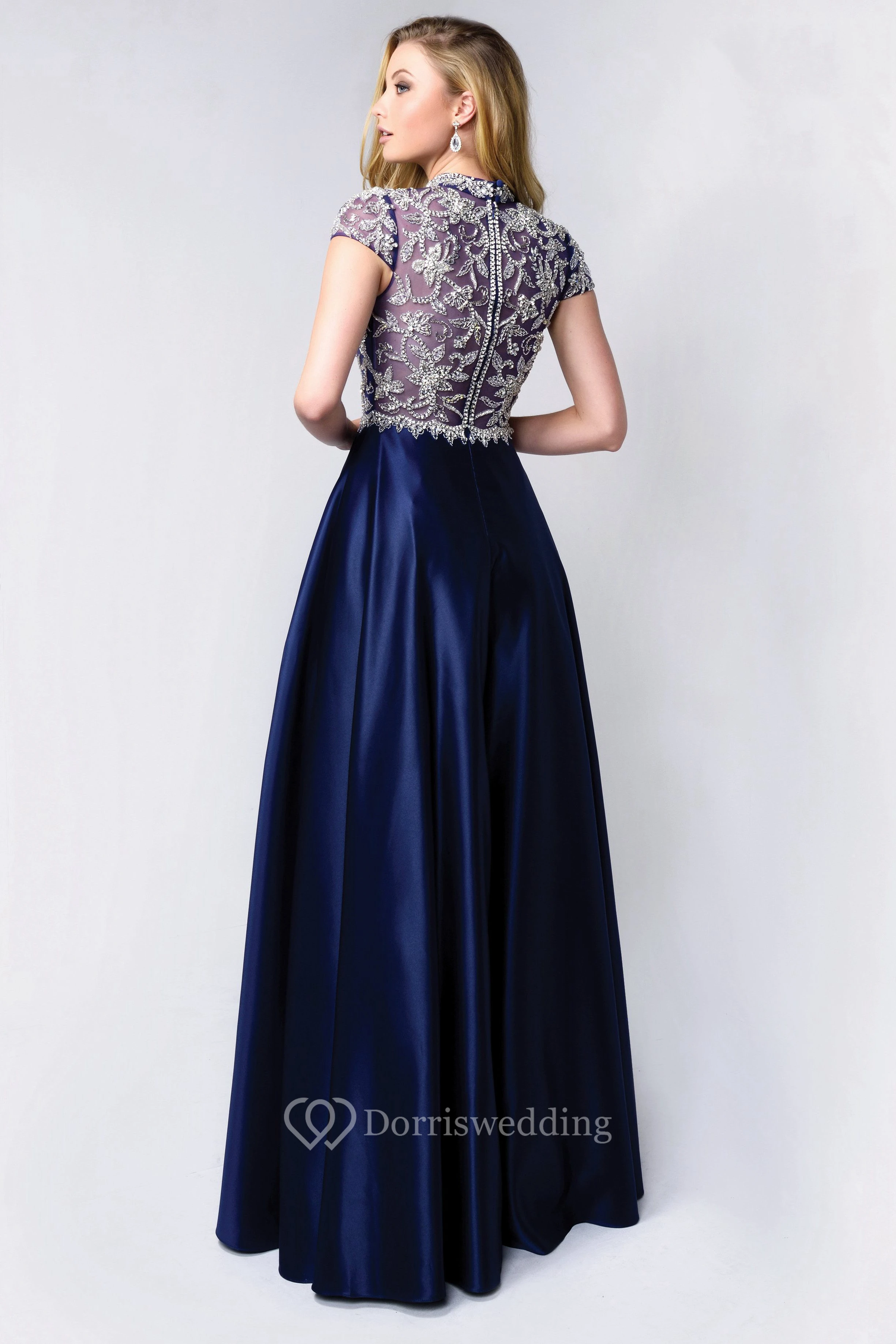 A-Line High Neck Short Sleeve Satin Illusion Dress With Beading And Pleats