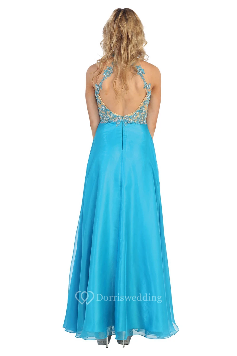 A-Line High Neck Sleeveless Chiffon Keyhole Dress With Appliques