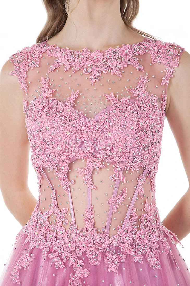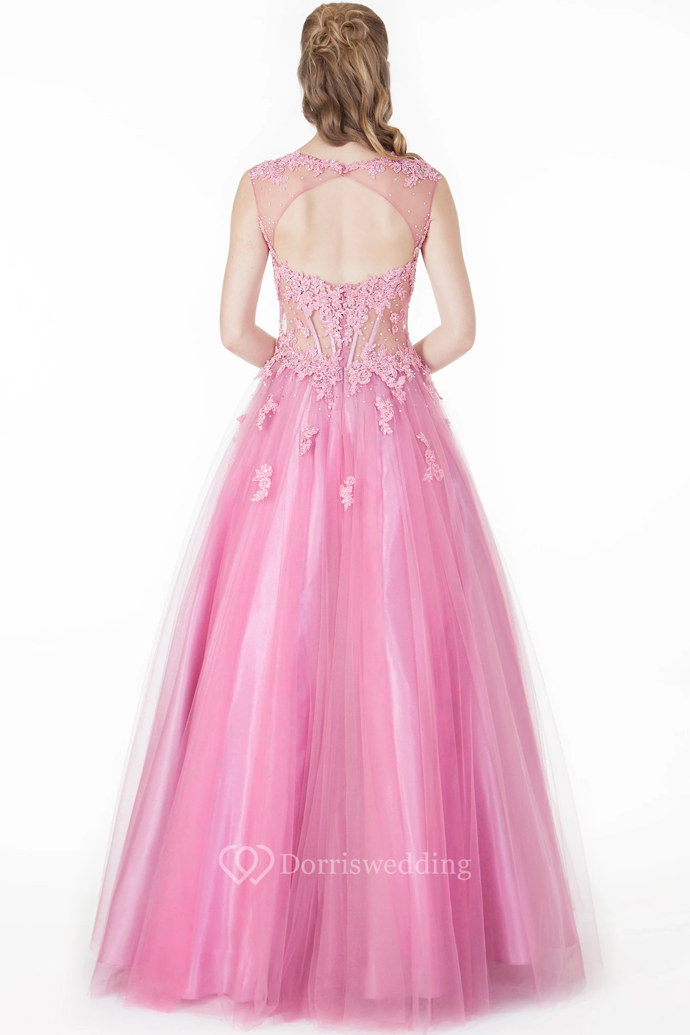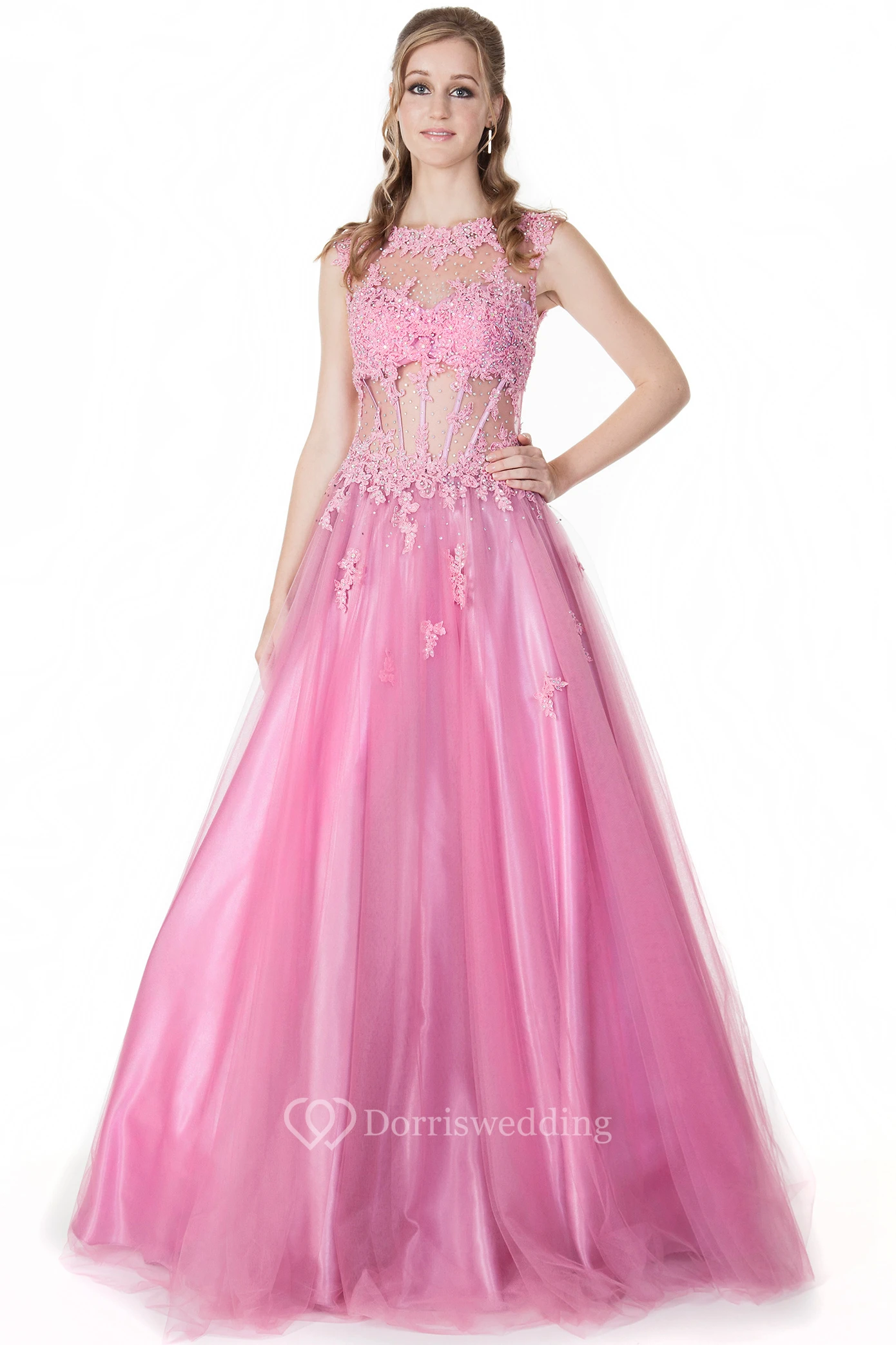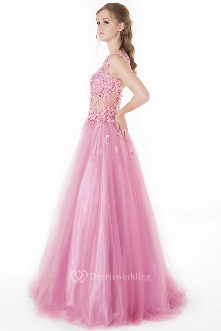 A-Line Jewel-Neck Appliqued Floor-Length Cap-Sleeve Tulle&Satin Prom Dress