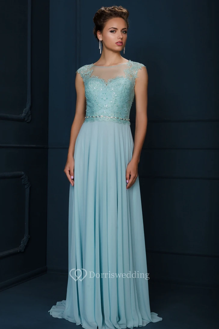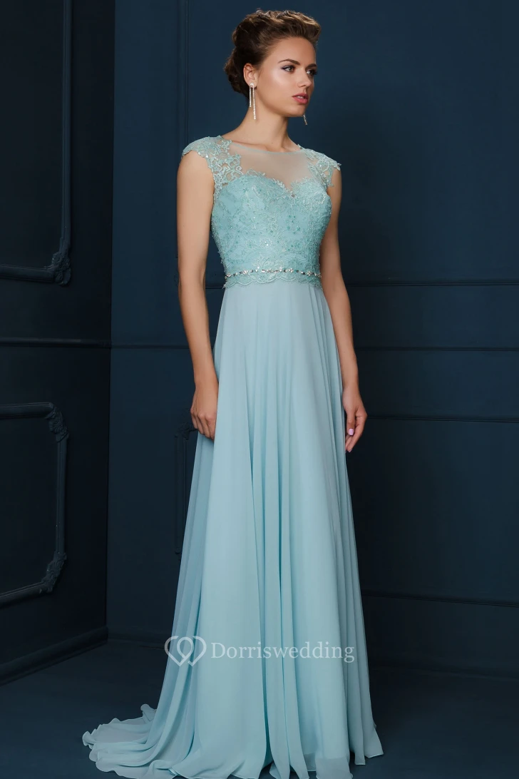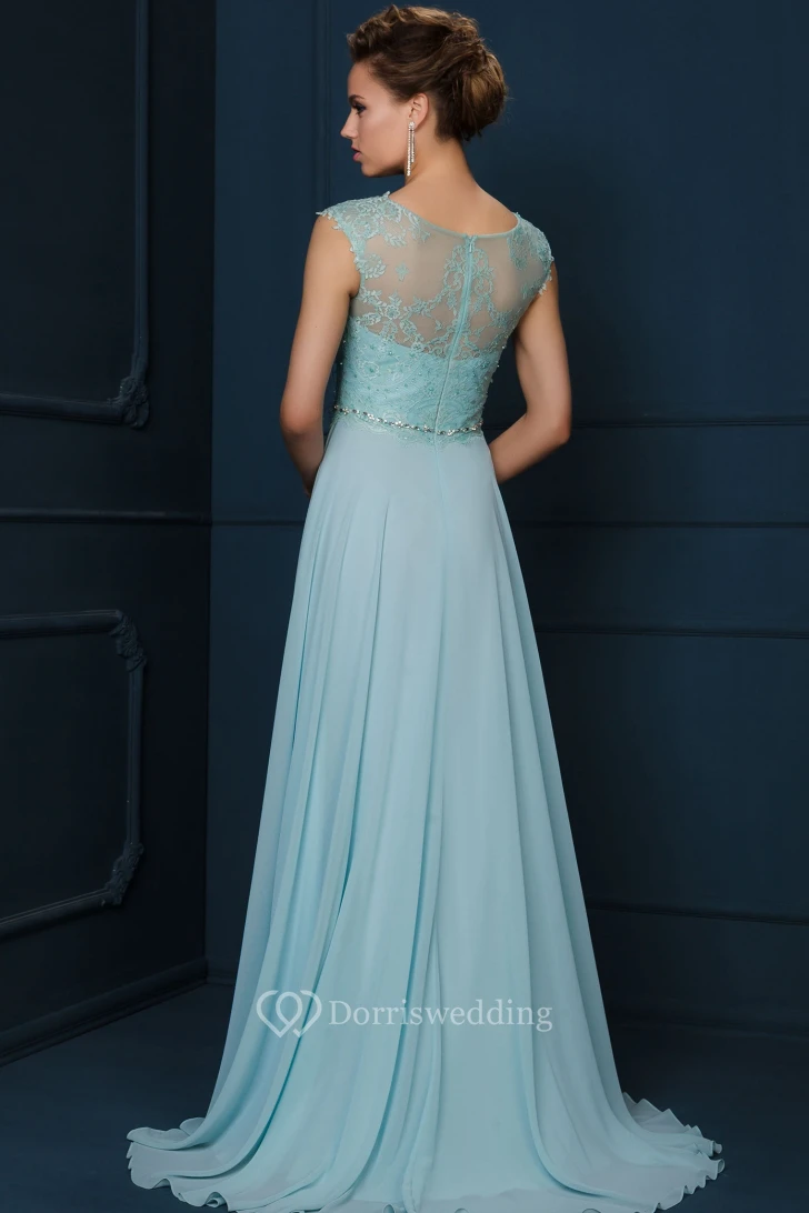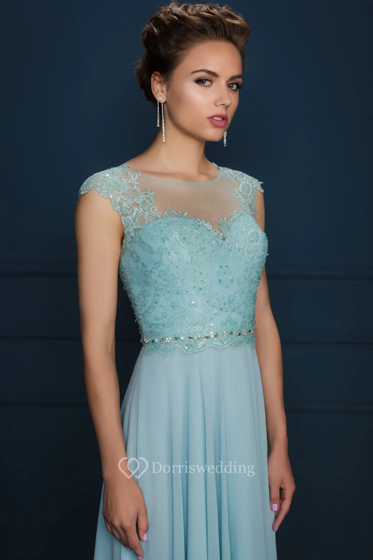 A-Line Jewel-Neck Cap-Sleeve Appliqued Maxi Chiffon&Lace Evening Dress With Beading And Pleats