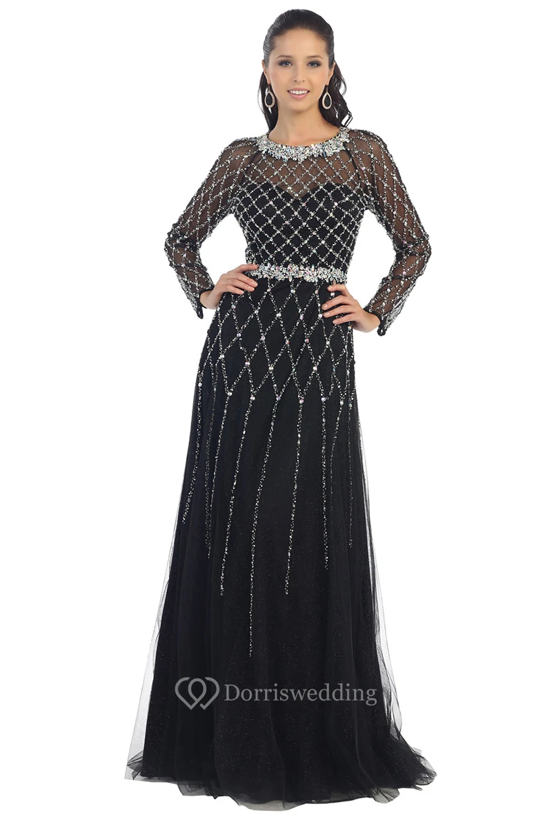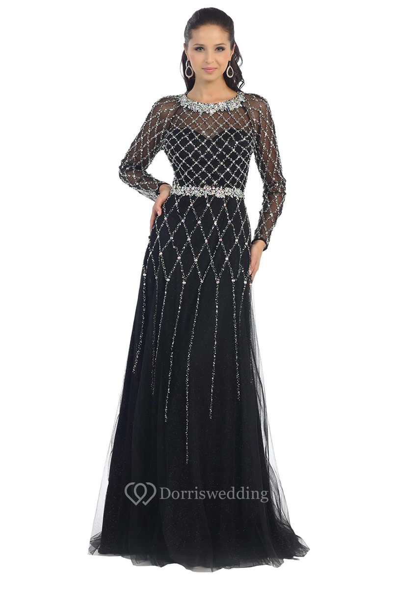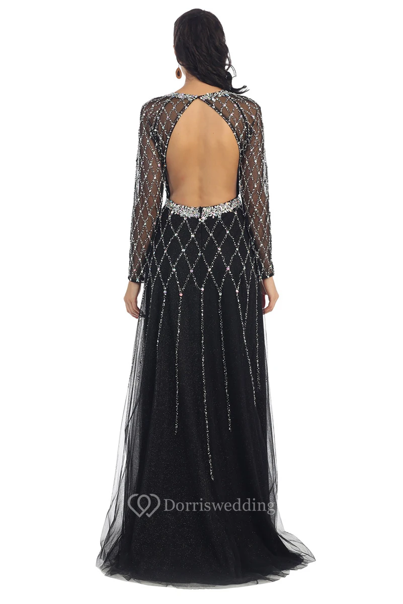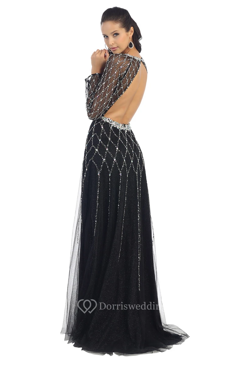 A-Line Jewel-Neck Long Sleeve Tulle Backless Dress With Beading