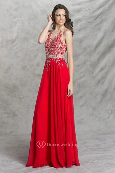 A-Line Jewel-Neck Sleeveless Chiffon Illusion Dress With Beading And Pleats