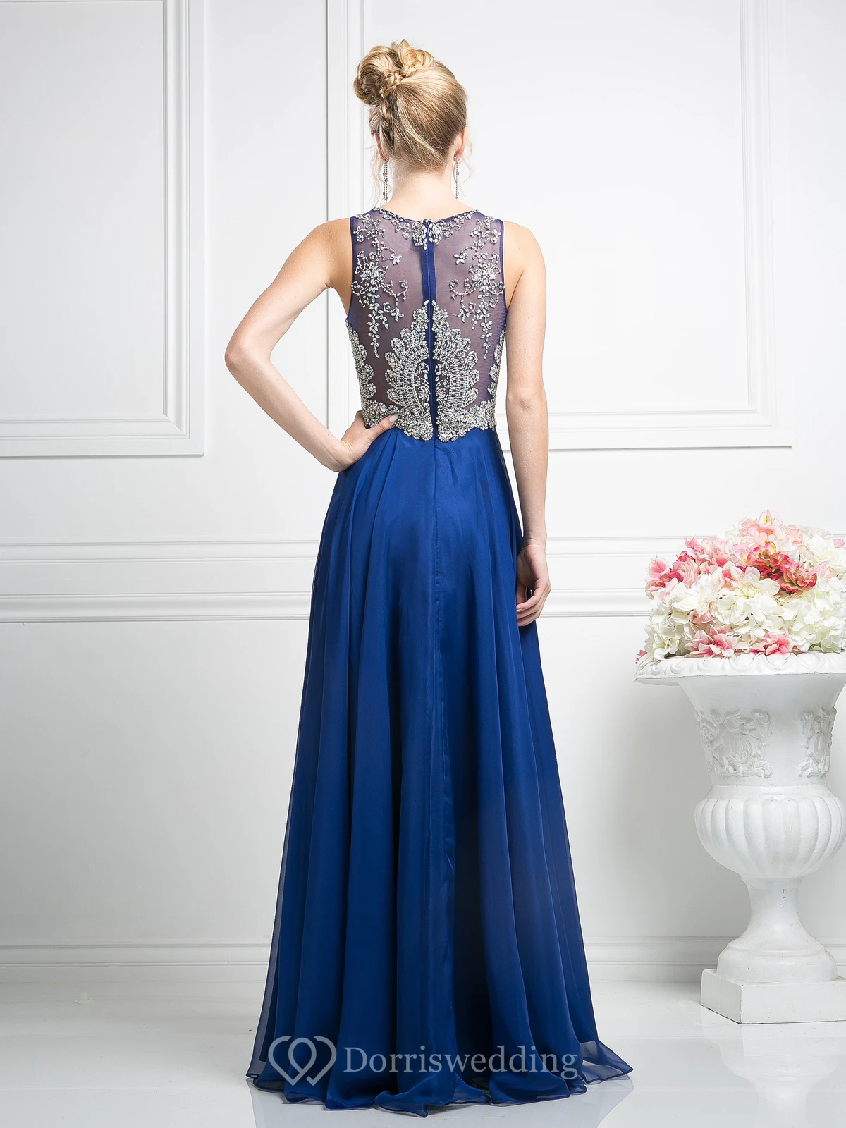 A-Line Jewel-Neck Sleeveless Chiffon Illusion Dress With Beading And Pleats