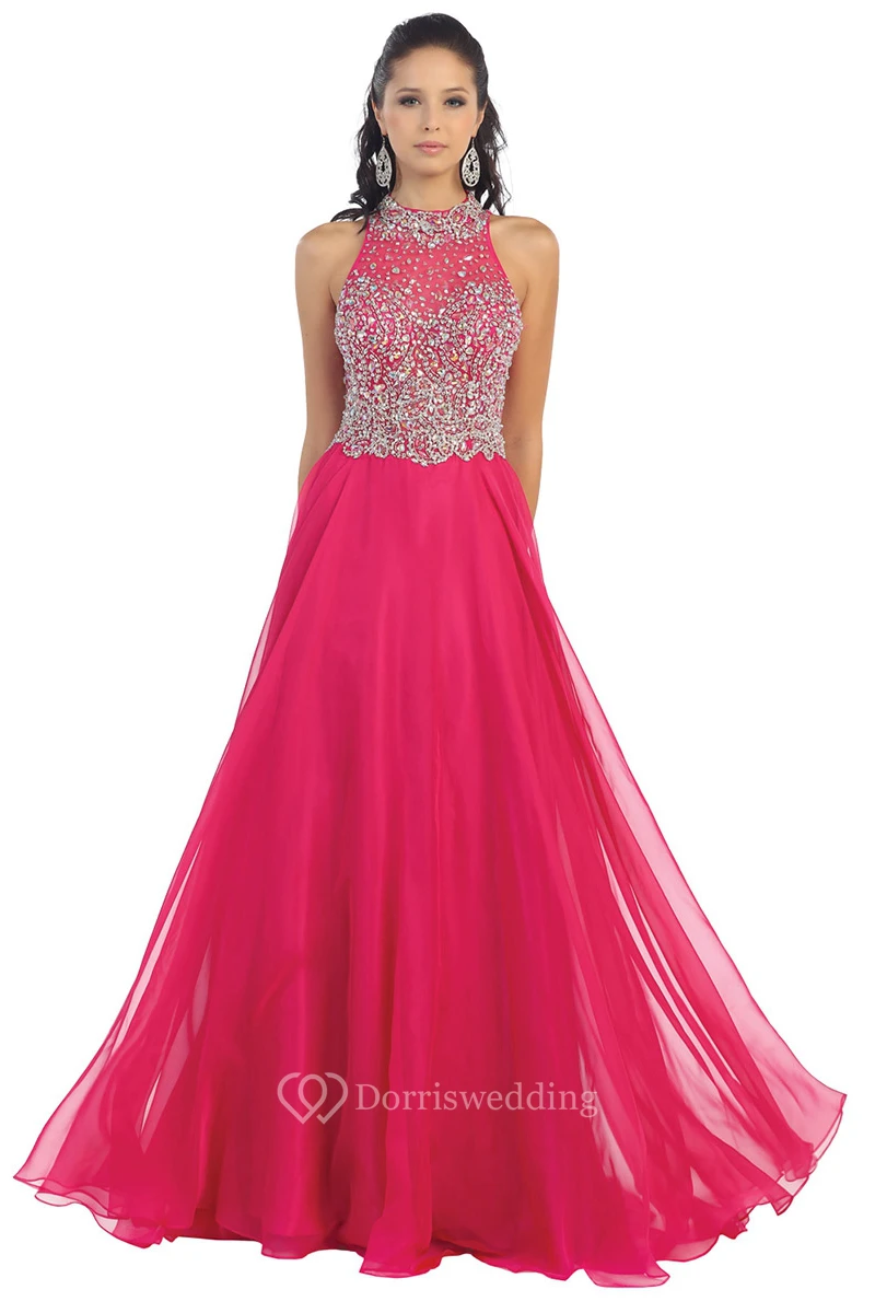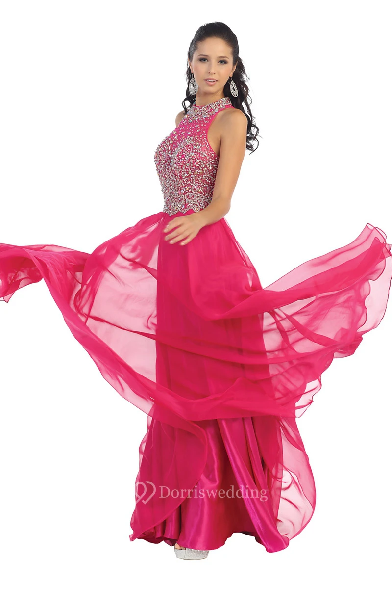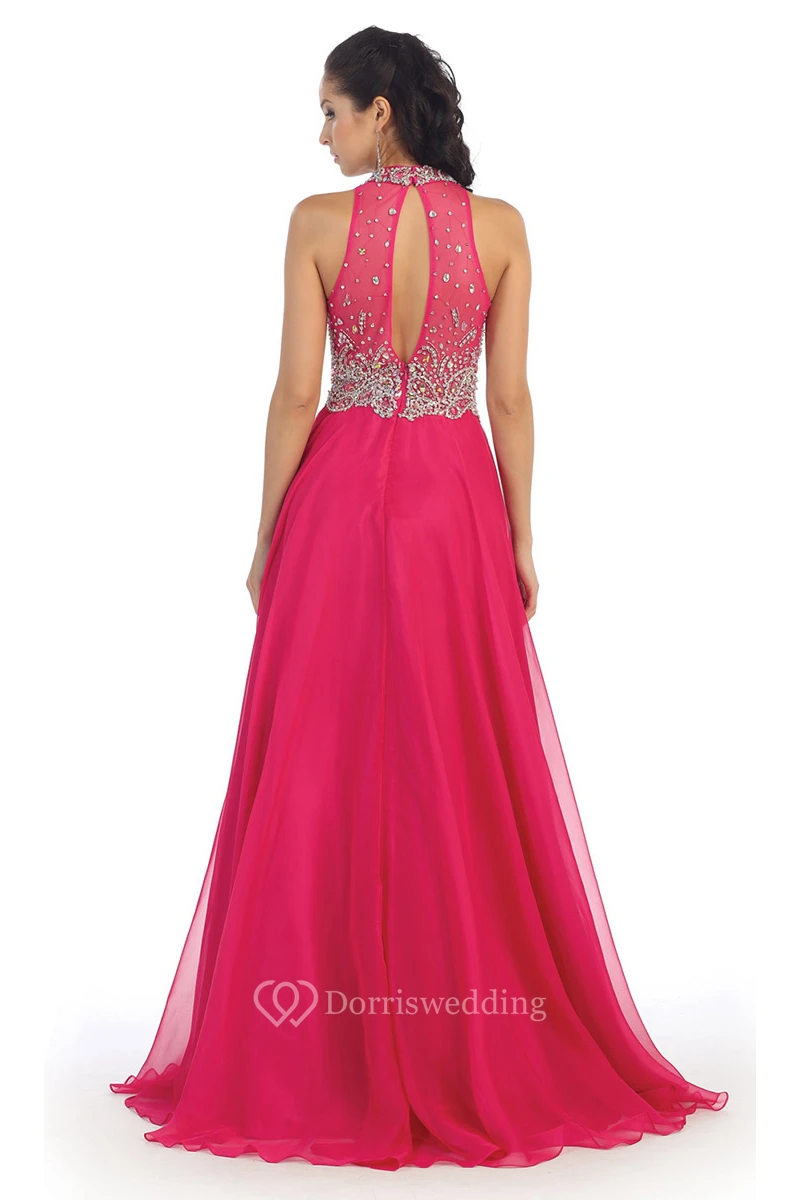 A-Line Jewel-Neck Sleeveless Chiffon Illusion Dress With Beading And Pleats