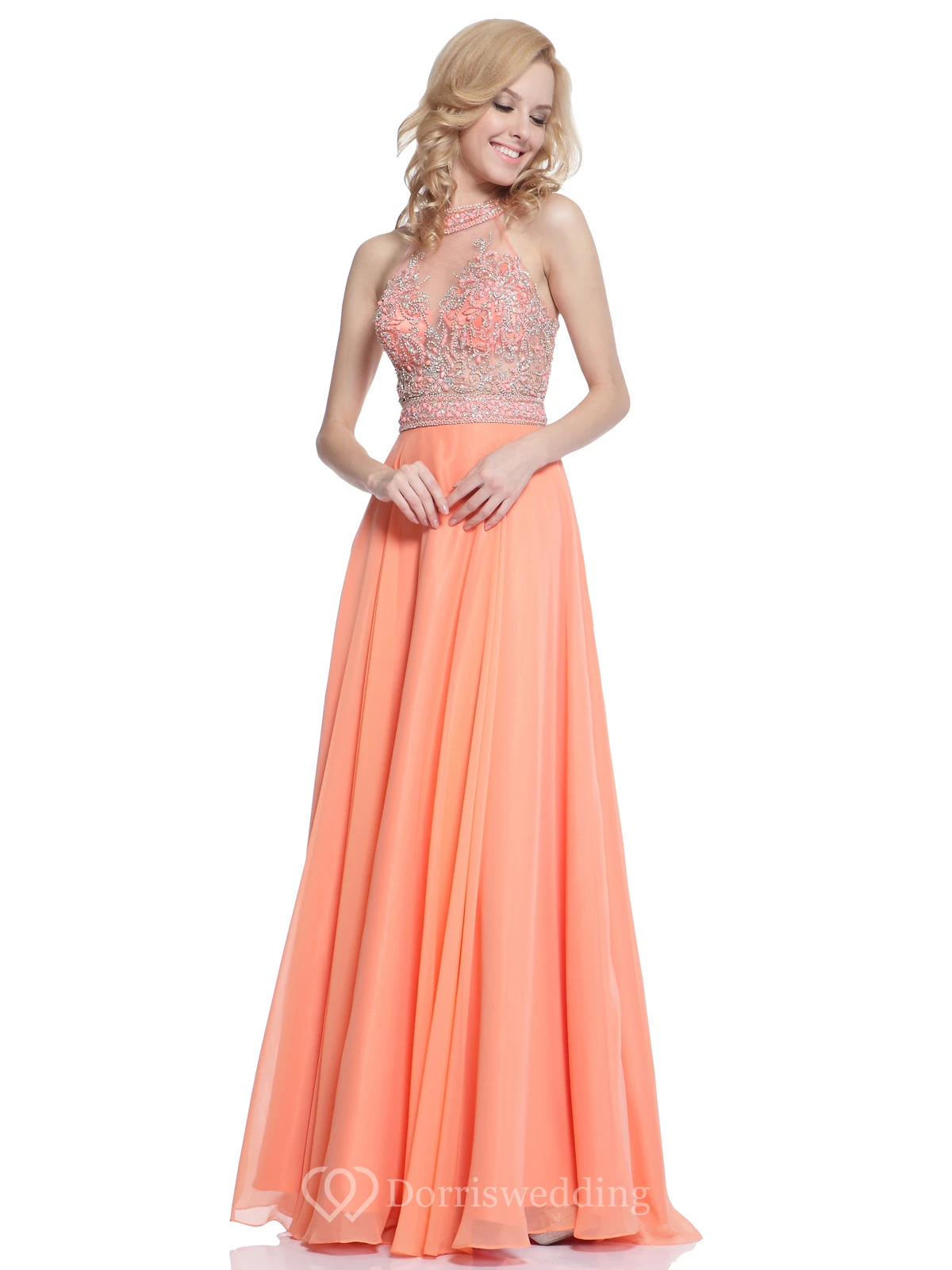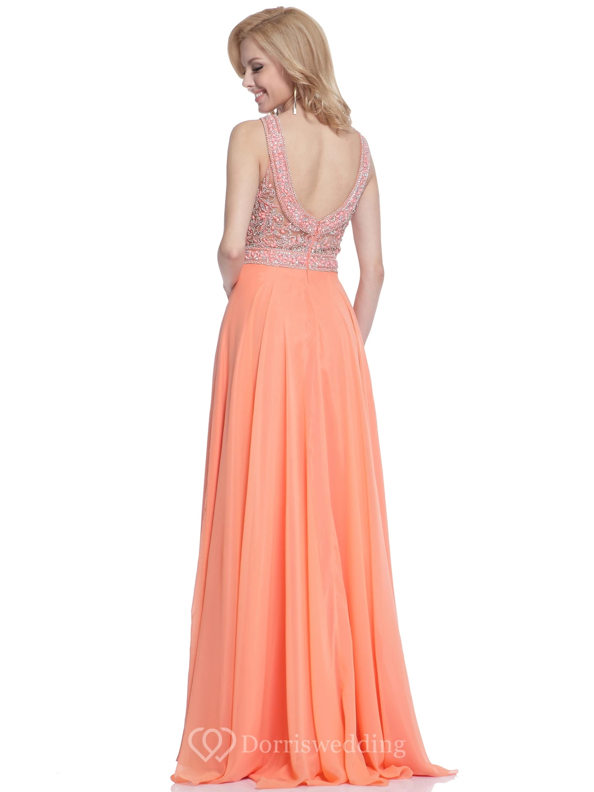 A-Line Jewel-Neck Sleeveless Chiffon Low-V Back Dress With Beading And Pleats