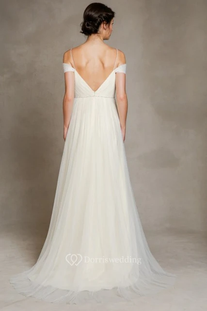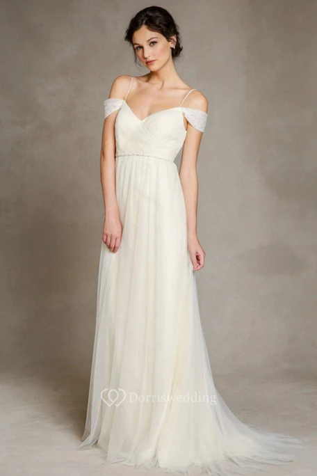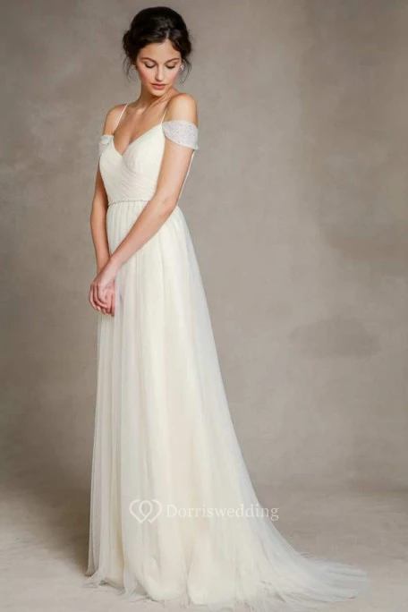 A-Line Jeweled Floor-Length Spaghetti Tulle Wedding Dress With Pleats